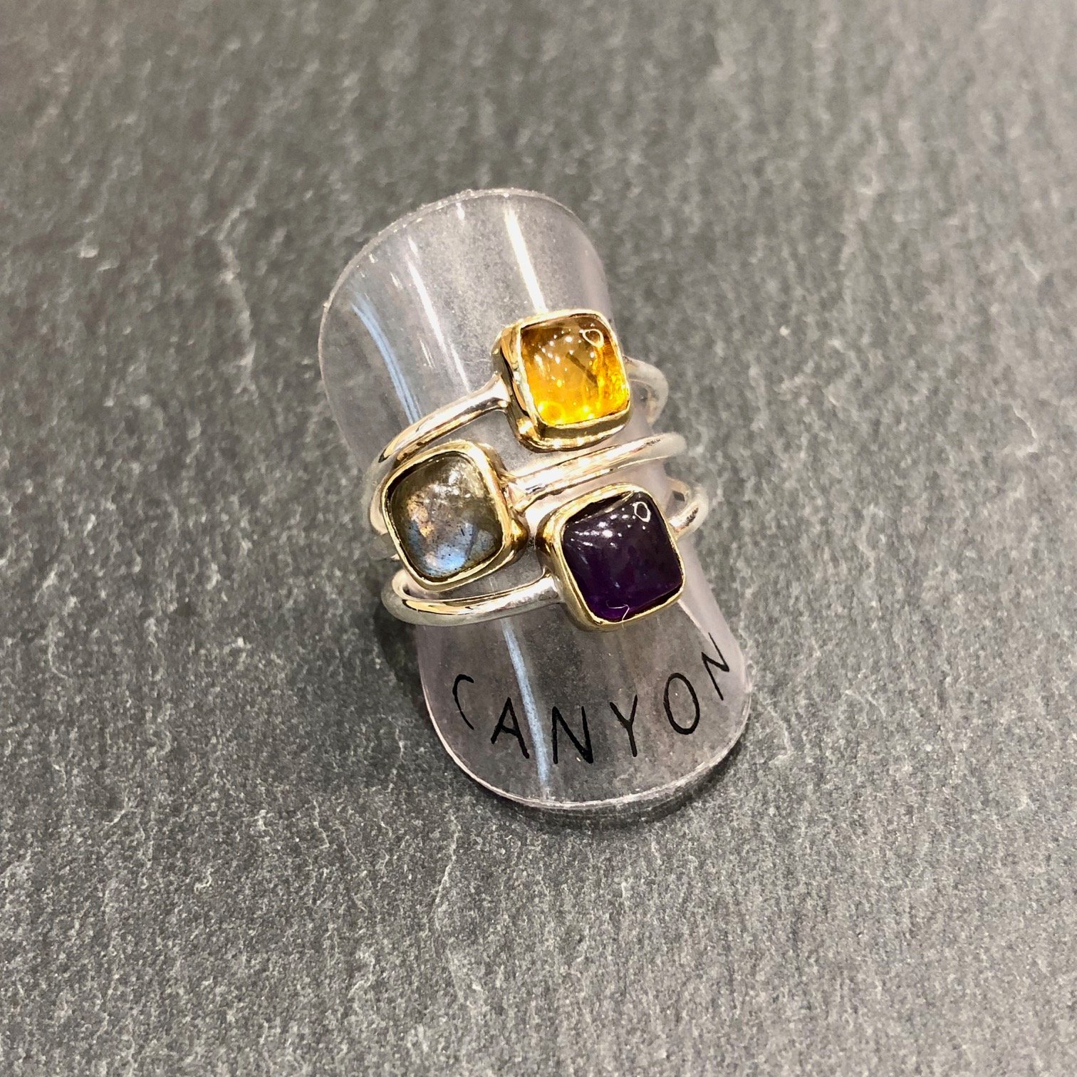 Bague en argent 925 composée de 3 anneaux reliés, chacun orné d’un cabochon en améthyste, labradorite et citrine serti en laiton .