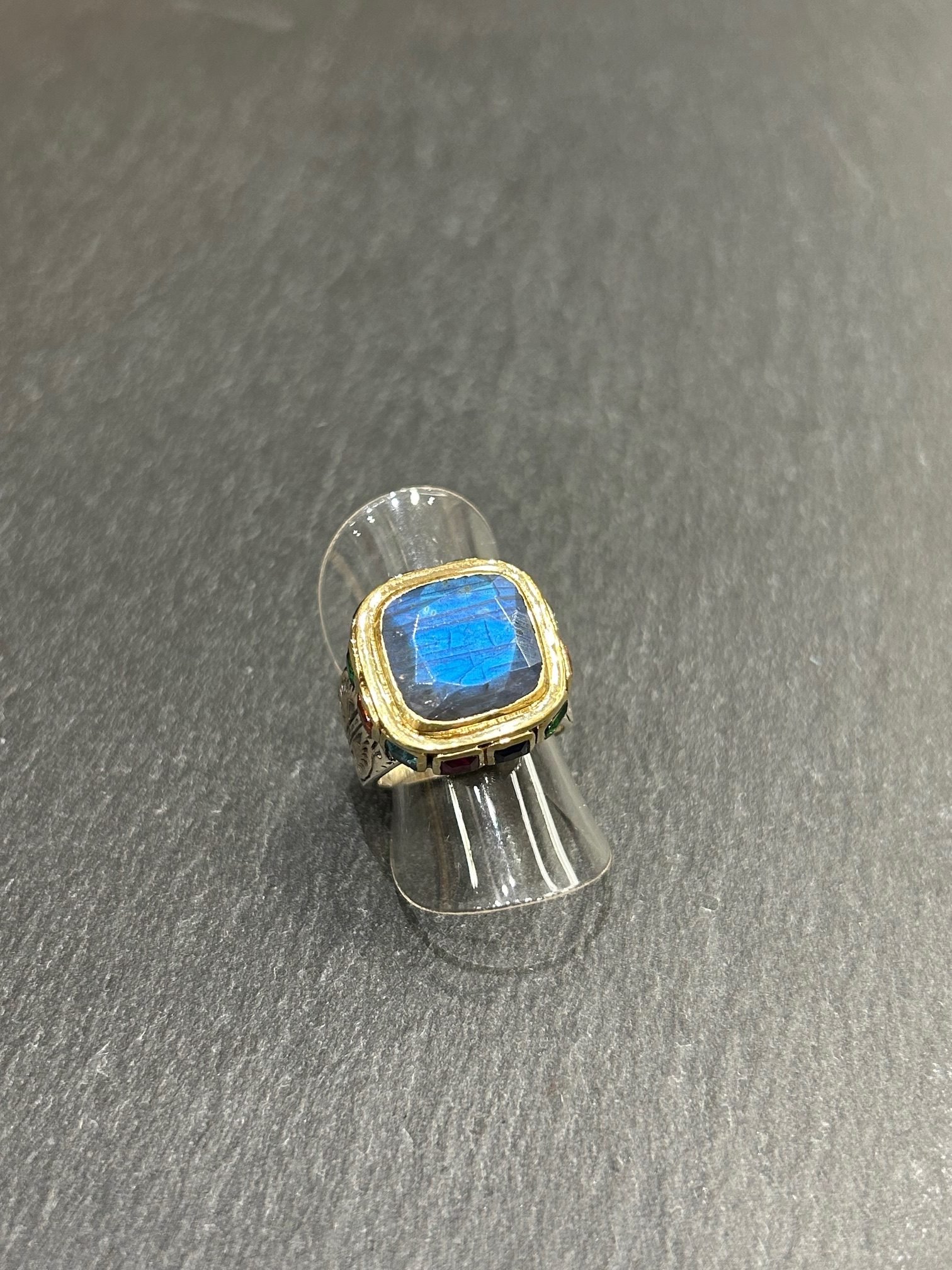 Bague en argent 925 finement gravée, ornée d’un cabochon carré en labradorite serti de multiple pierres semi précieuse tout autour.