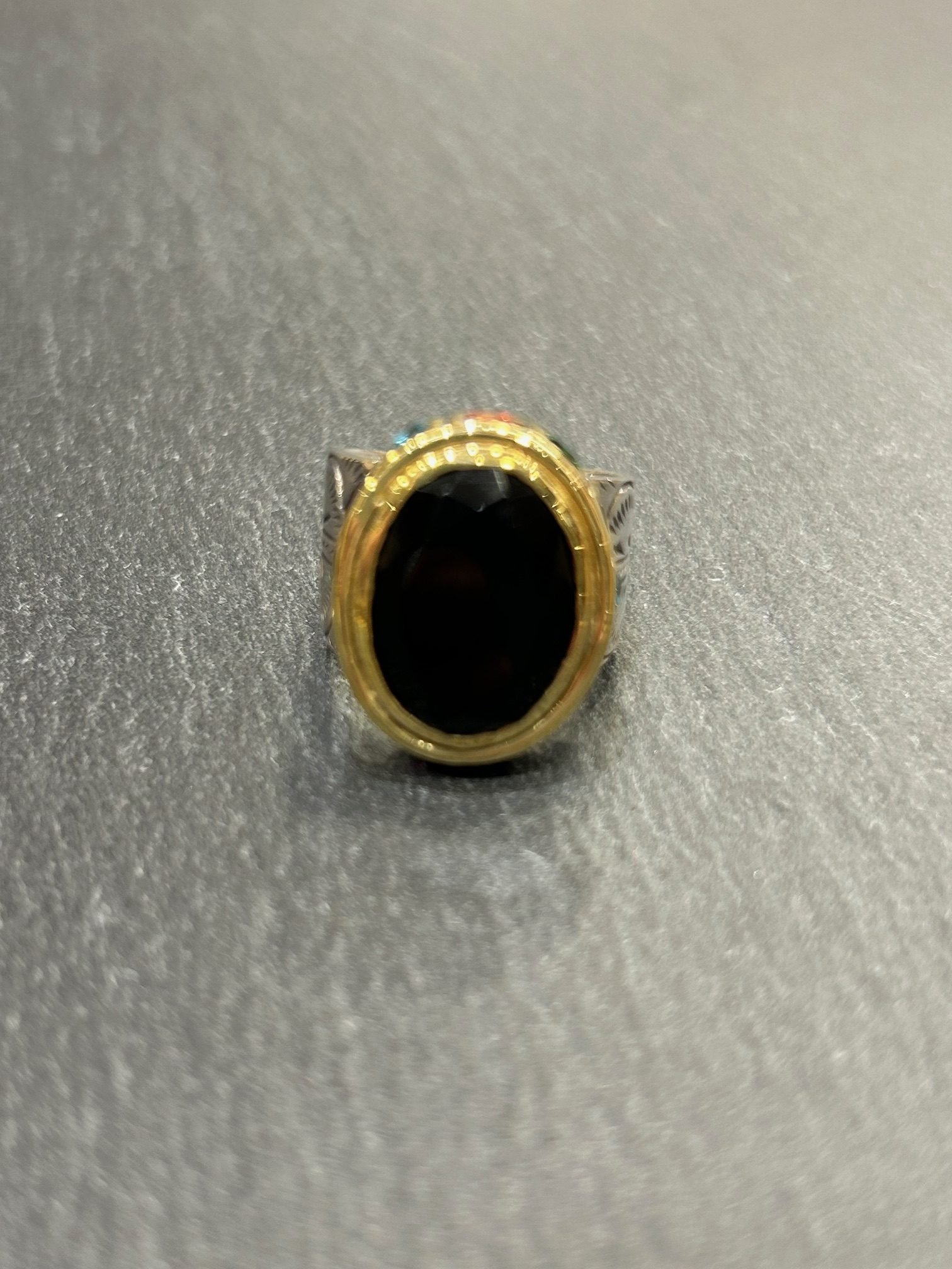 Bague en argent 925 finement gravée, ornée d’un cabochon ovale en onyx serti de multiple pierres semi précieuse tout autour.