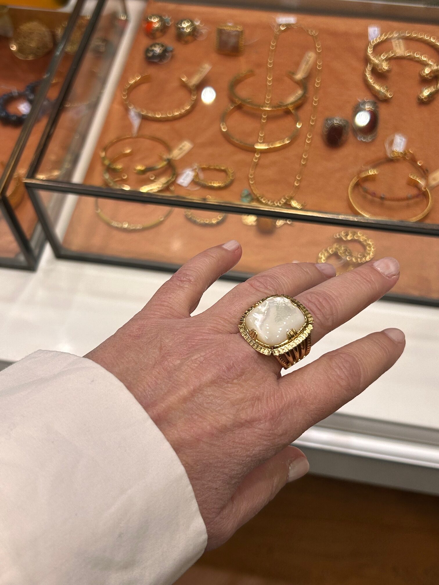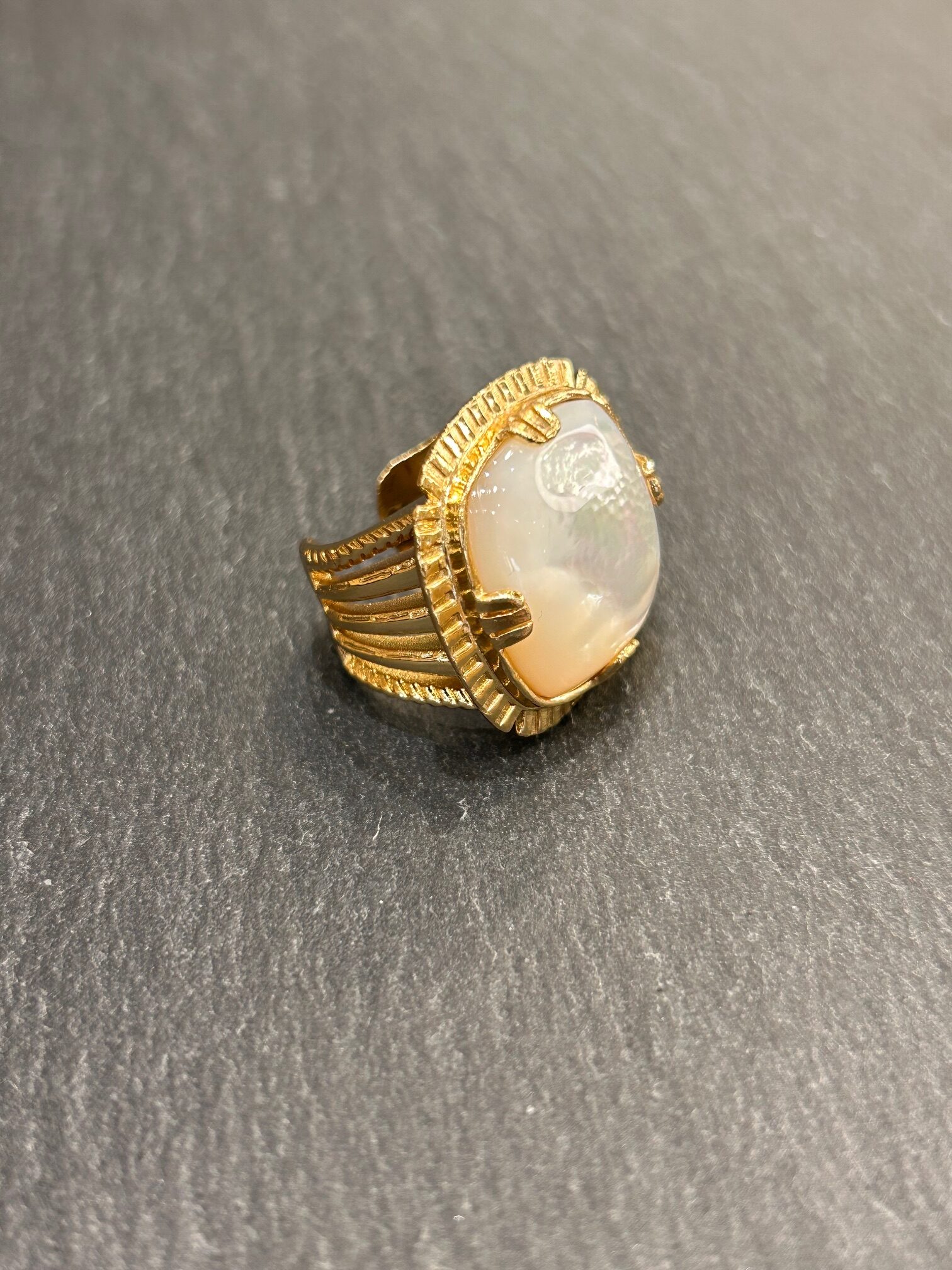 Son design ajustable offre un confort idéal au quotidien. De plus, elle s’adapte facilement à chaque doigt. La monture dorée à l’or fin souligne la douceur de la nacre. Cependant, l’ensemble conserve une présence affirmée et élégante.