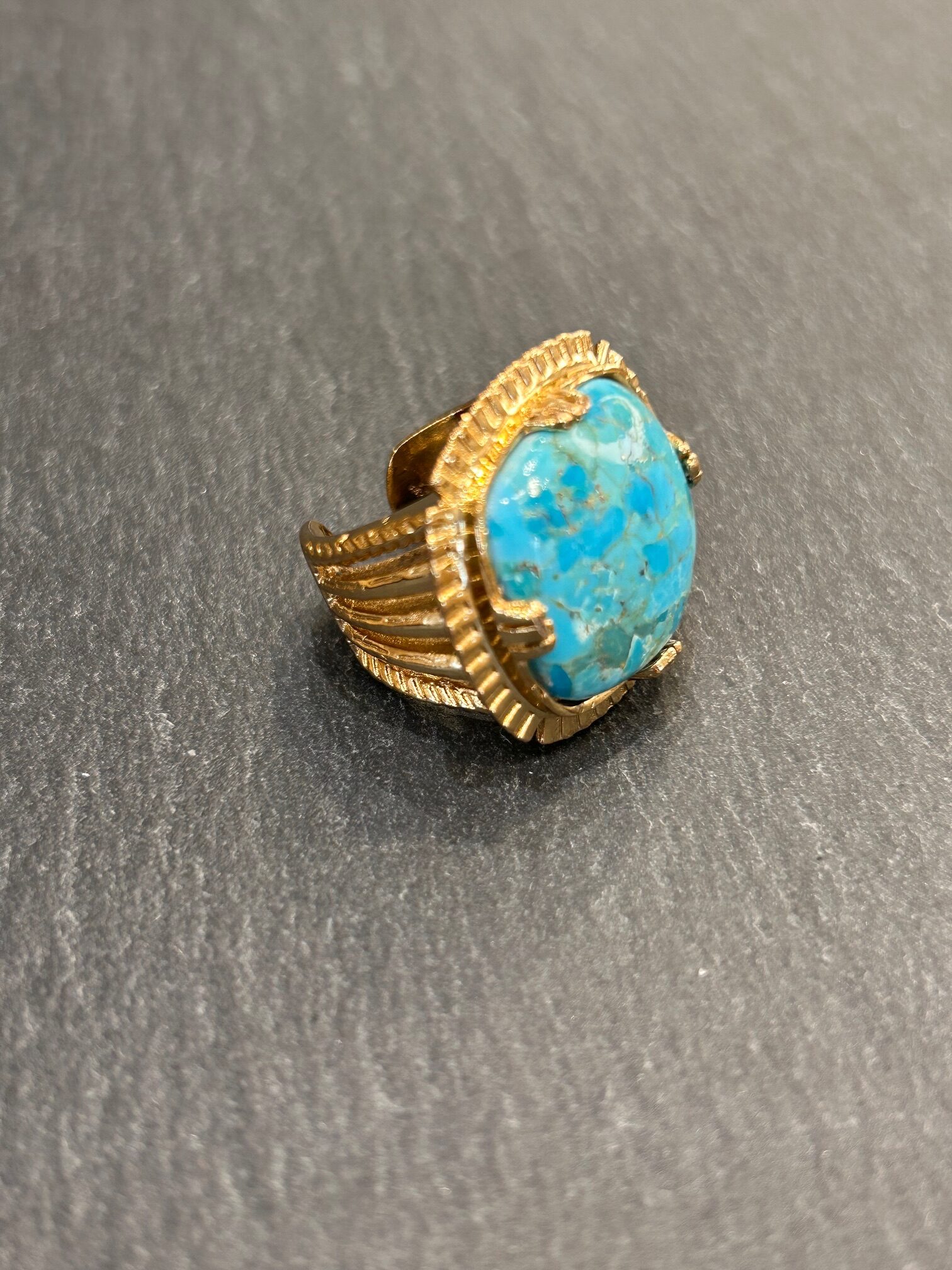 La bague turquoise dorée incarne une élégance audacieuse et contemporaine. Elle attire immédiatement le regard grâce à son cabochon turquoise généreux. Ainsi, elle apporte une touche de couleur vibrante à votre main. Sa finition dorée à l’or fin souligne chaque détail avec délicatesse.