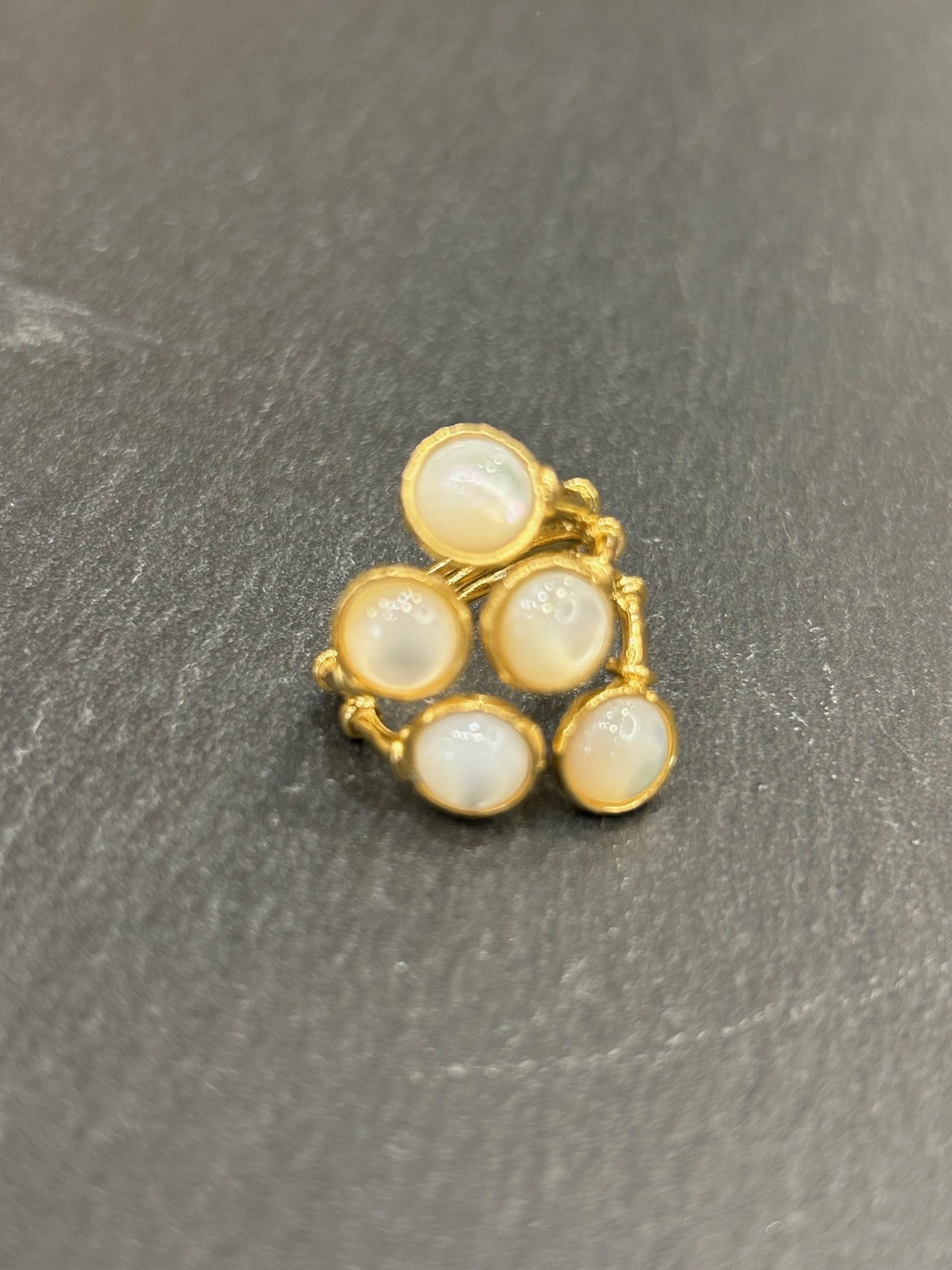 Bague rigide en métal doré à l’or fin, composé de 5 cabochons de nacre sertie.