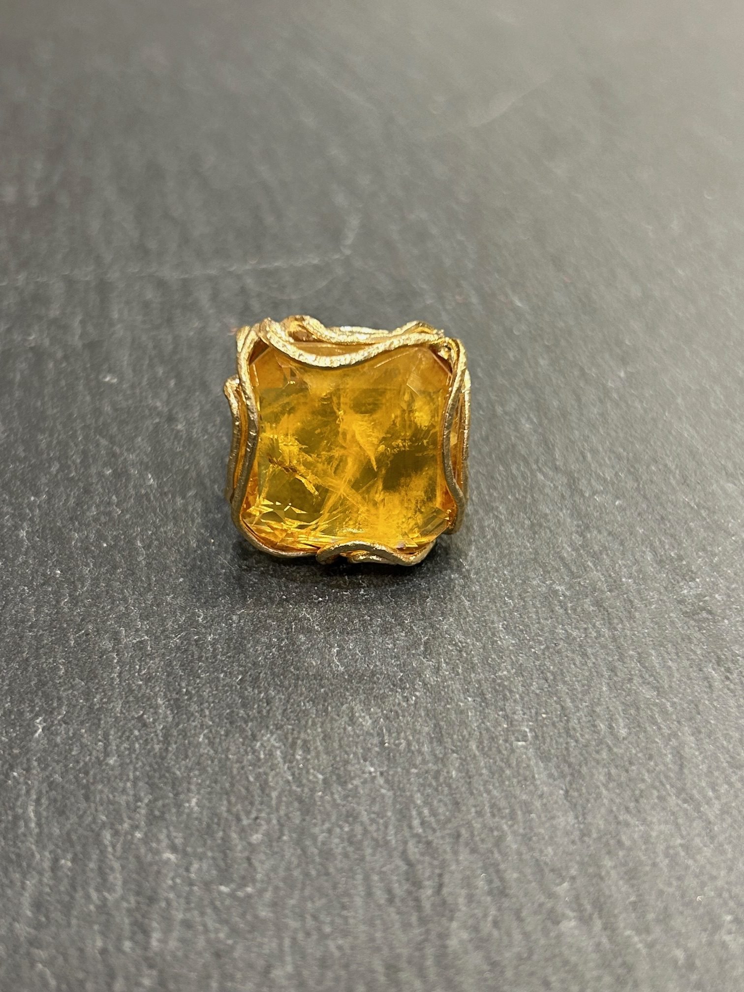 Bague en argent plaquée or finement ajourée ornée d’ un cabochon en citrine.