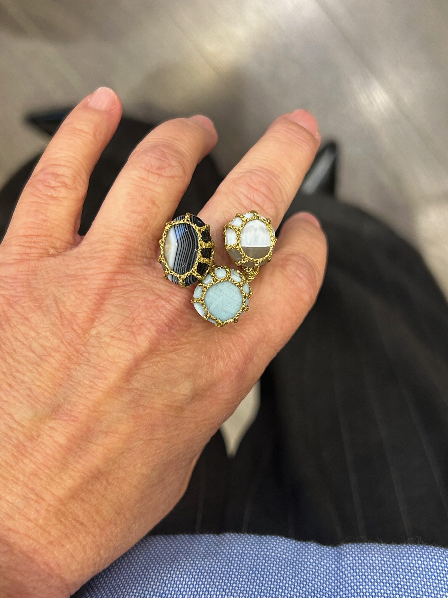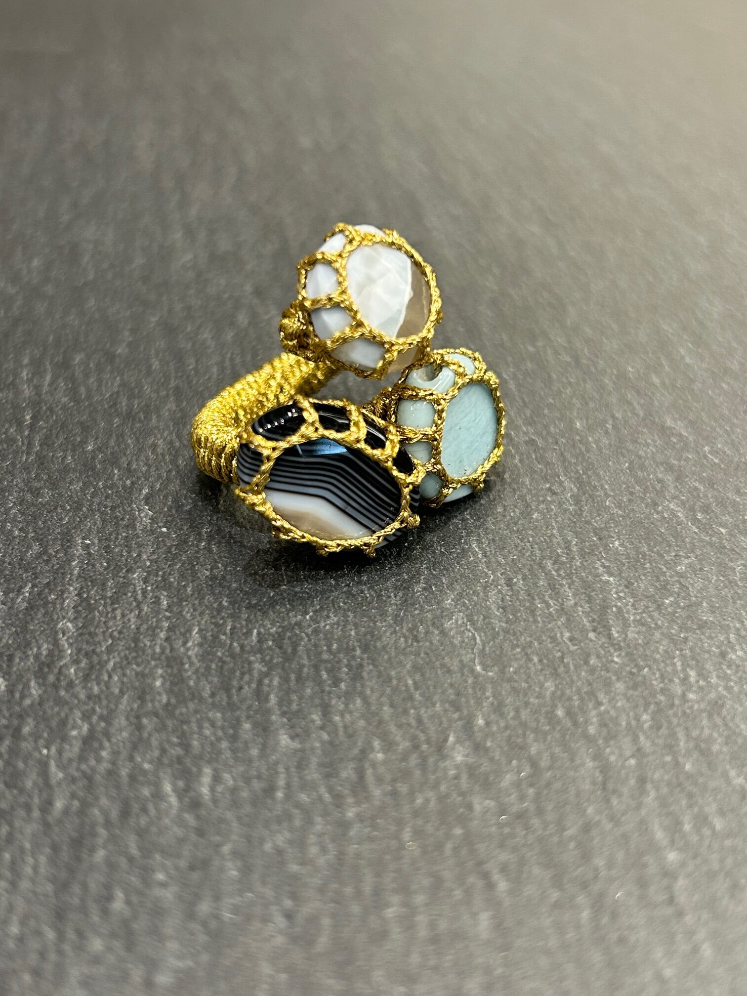 Cette bague réglable s’adapte à toutes les mains avec fluidité. Vous pouvez donc la porter au quotidien ou lors d’occasions plus solennelles. Grâce à sa structure légère, elle reste agréable même après plusieurs heures. Par ailleurs, le contraste entre les pierres et la texture du fil attire le regard avec subtilité, sans jamais être excessif.