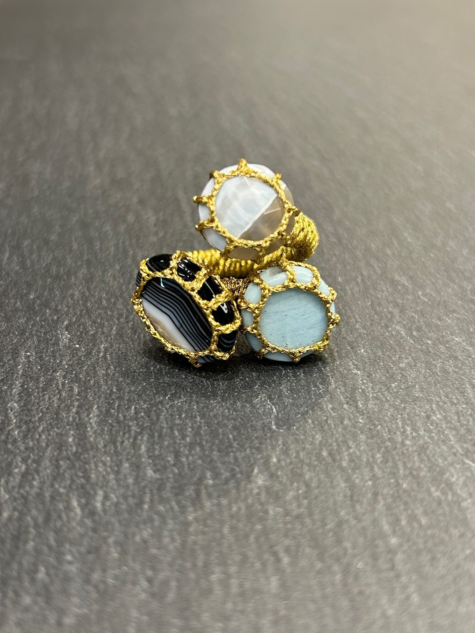 La bague pierres naturelles ITZA Ciel Nuageux capture l’esprit poétique d’un ciel en mouvement. Chaque pierre, soigneusement choisie, révèle des nuances subtiles qui rappellent la lumière changeante des nuages. Le fil à broder, délicatement travaillé autour de la trilogie minérale, apporte une touche unique et audacieuse. Cette alliance inattendue entre la matière brute et le fil coloré traduit parfaitement l’artisanat raffiné de la maison Boks and Baum.