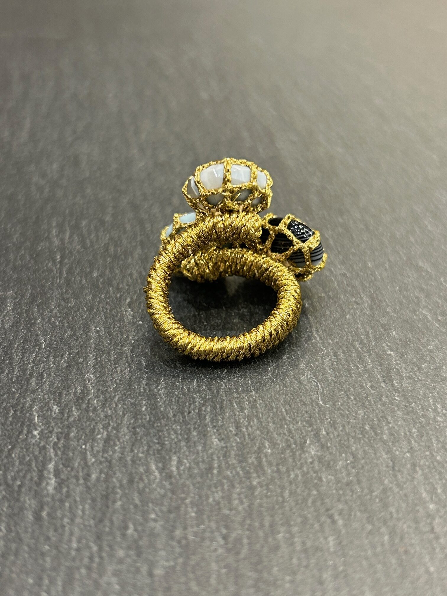 De plus, le choix des matériaux naturels confère une dimension précieuse à ce bijou. La bague ne se contente pas d’orner la main : elle raconte une histoire de beauté, d’art et de délicatesse. Enfin, la présence du fil à broder, élément rare en joaillerie, signe la différence et incarne l’audace créative de la marque.