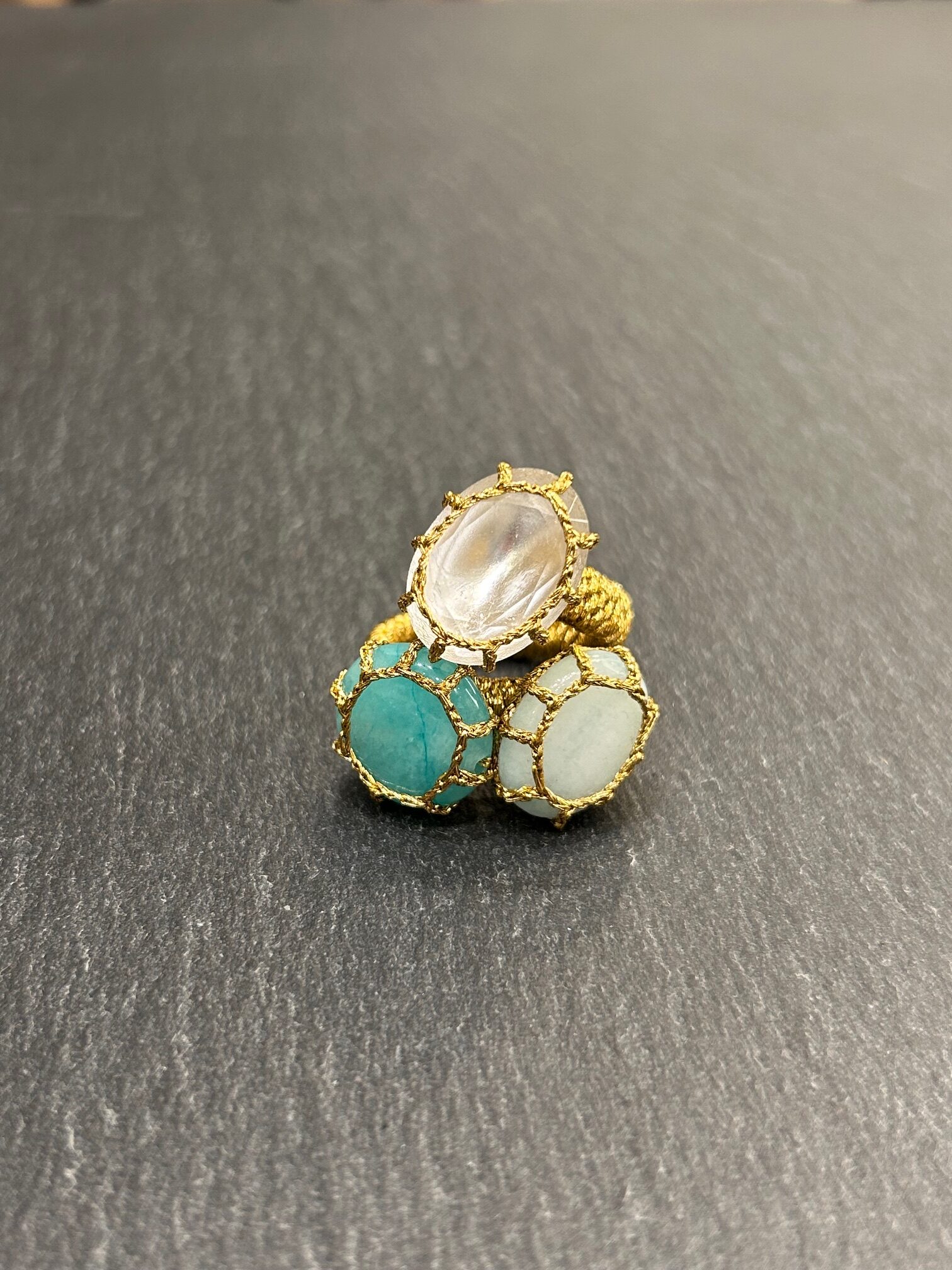 Cette création se distingue par ses trois pierres en cabochons. Elles sont serties avec soin grâce à des fils dorés. De plus, les perles de Murano ajoutent une touche artistique unique. Chaque élément révèle une harmonie parfaite entre textures et couleurs. Par ailleurs, la fabrication artisanale garantit un bijou singulier et précieux.