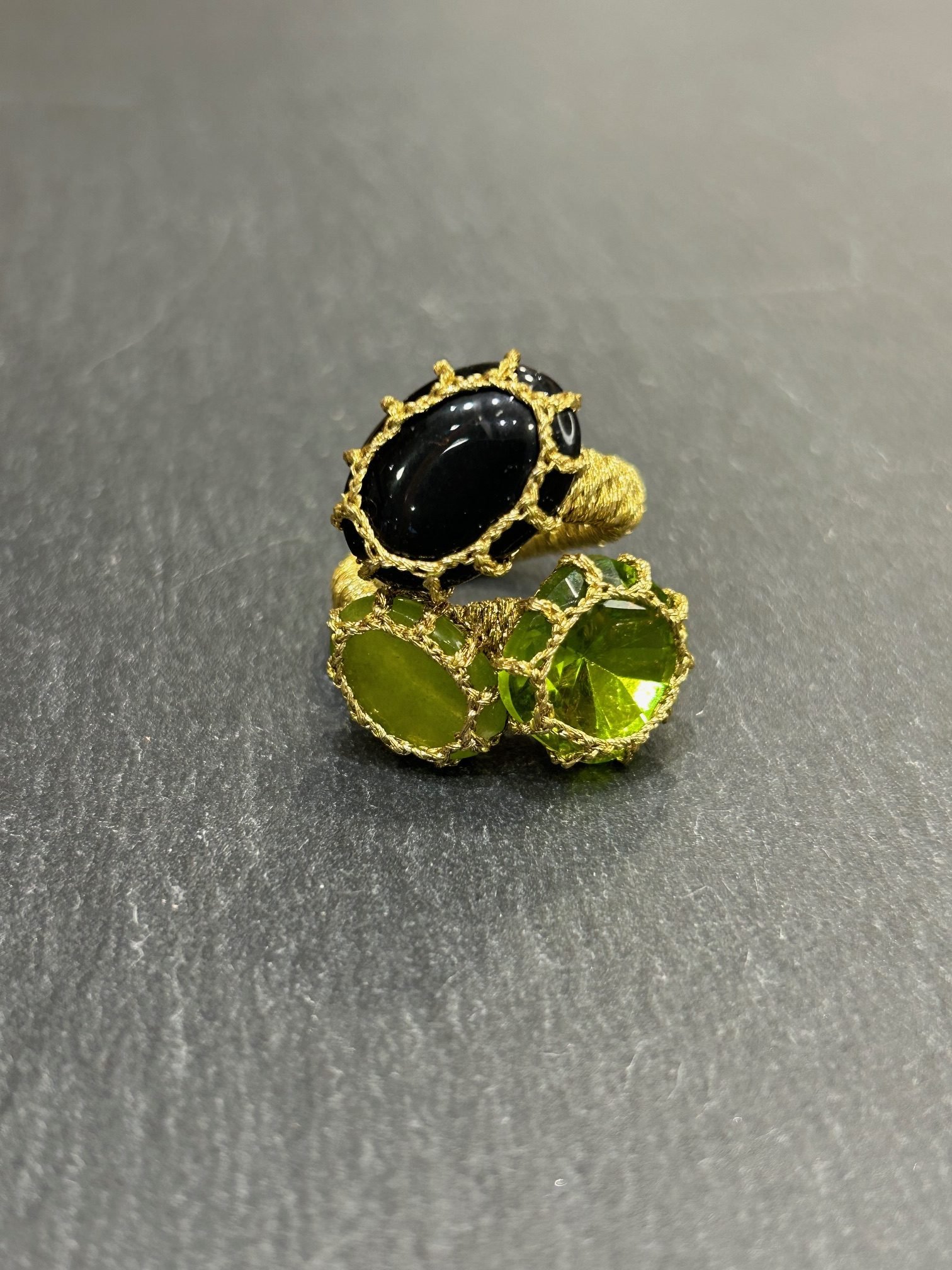 Bague dorées composées de trois délicats cabochons en pierres dans les tons de vert et noir, cousus à la main en fil à broder.