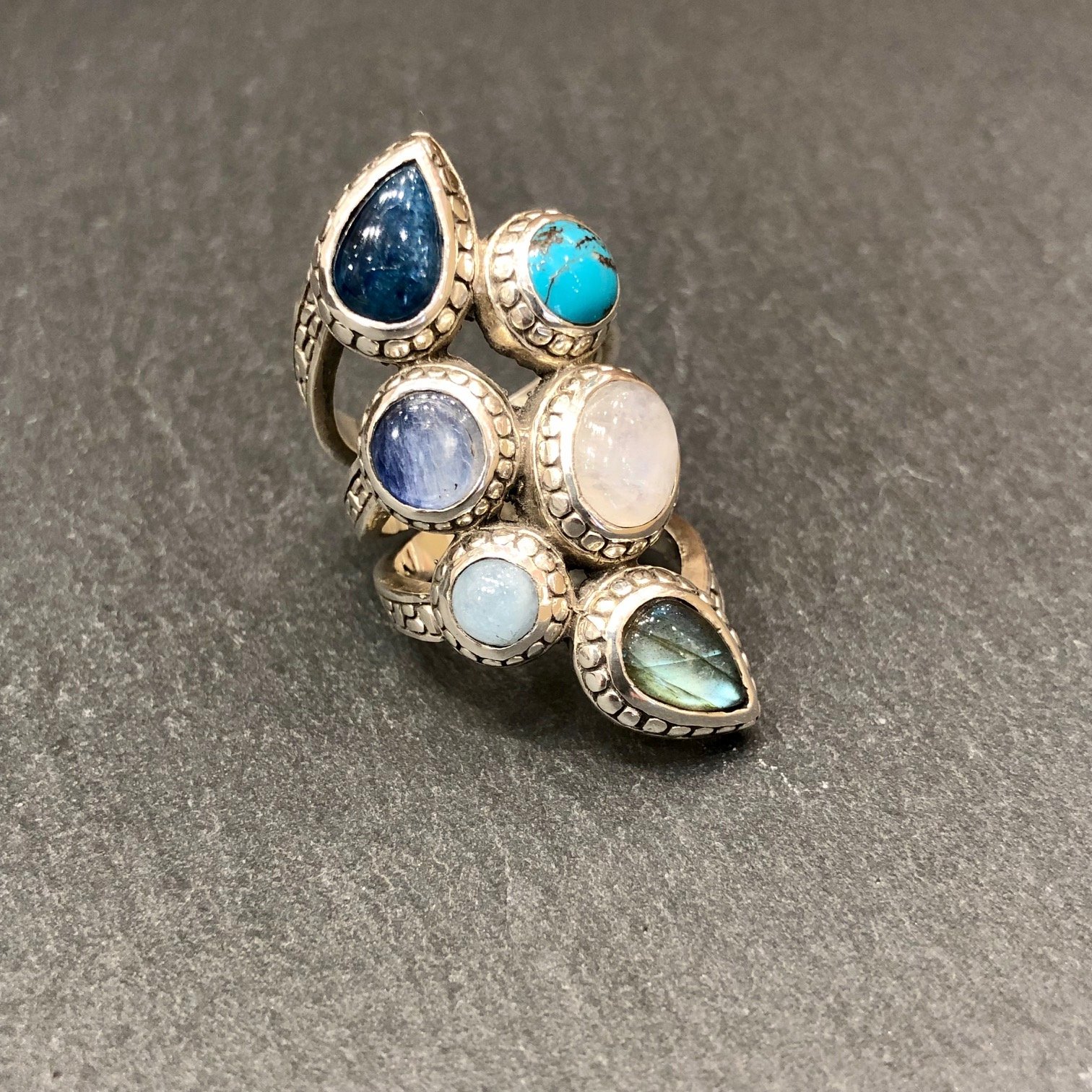 Bague en argent 925 sertie de 6 pierres cabochon Apatite, Turquoise, Cyanite, Pierre de Lune, Calcédoine, Labradorite .