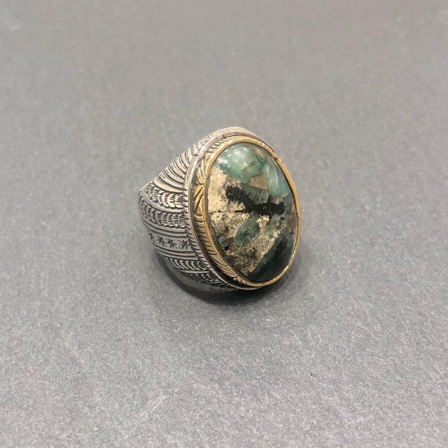 Bague en argent 925 sertie d une Emeraude, tour serti cuivre.