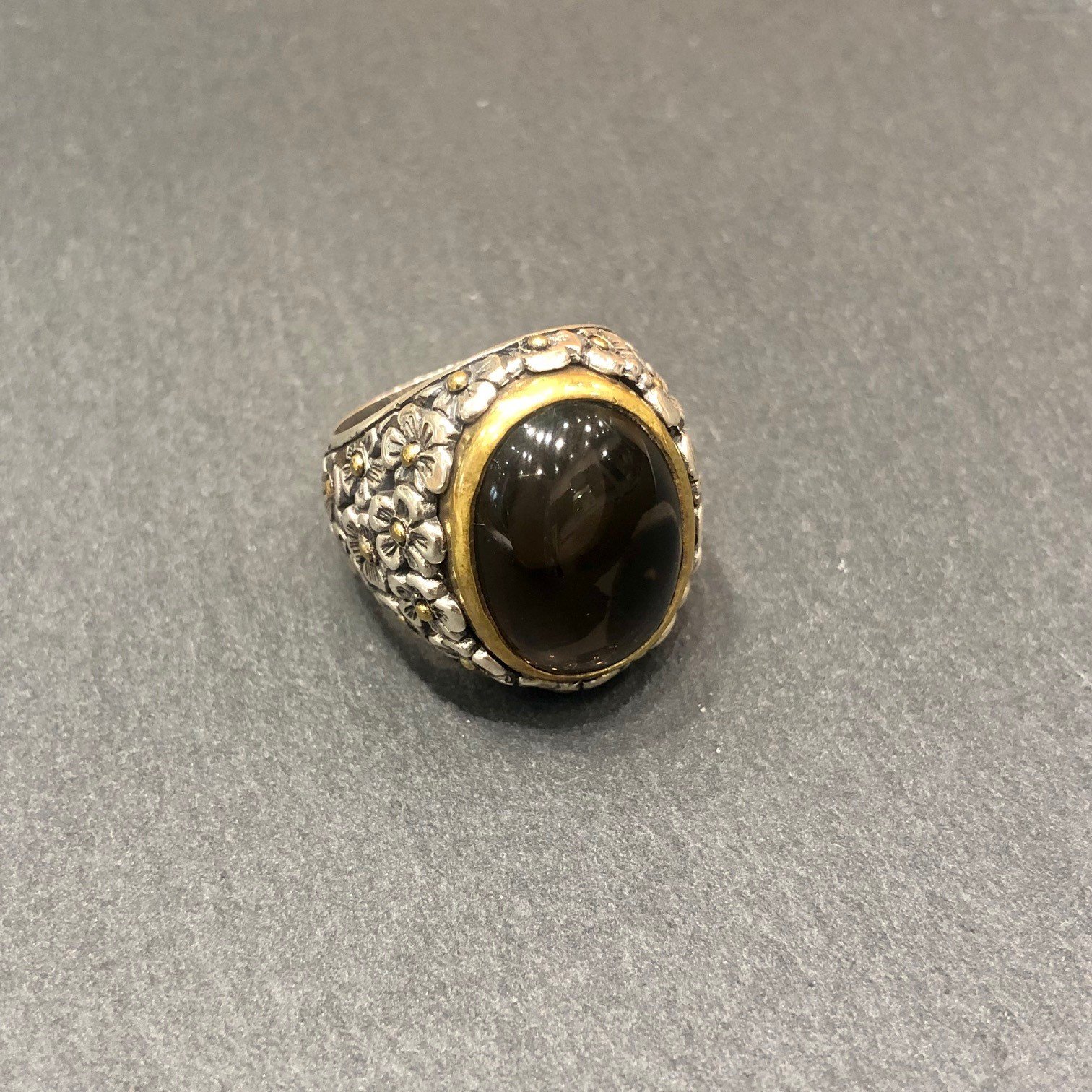 Bague en argent 925 sertie d une Quartz fumée, tour serti cuivre.