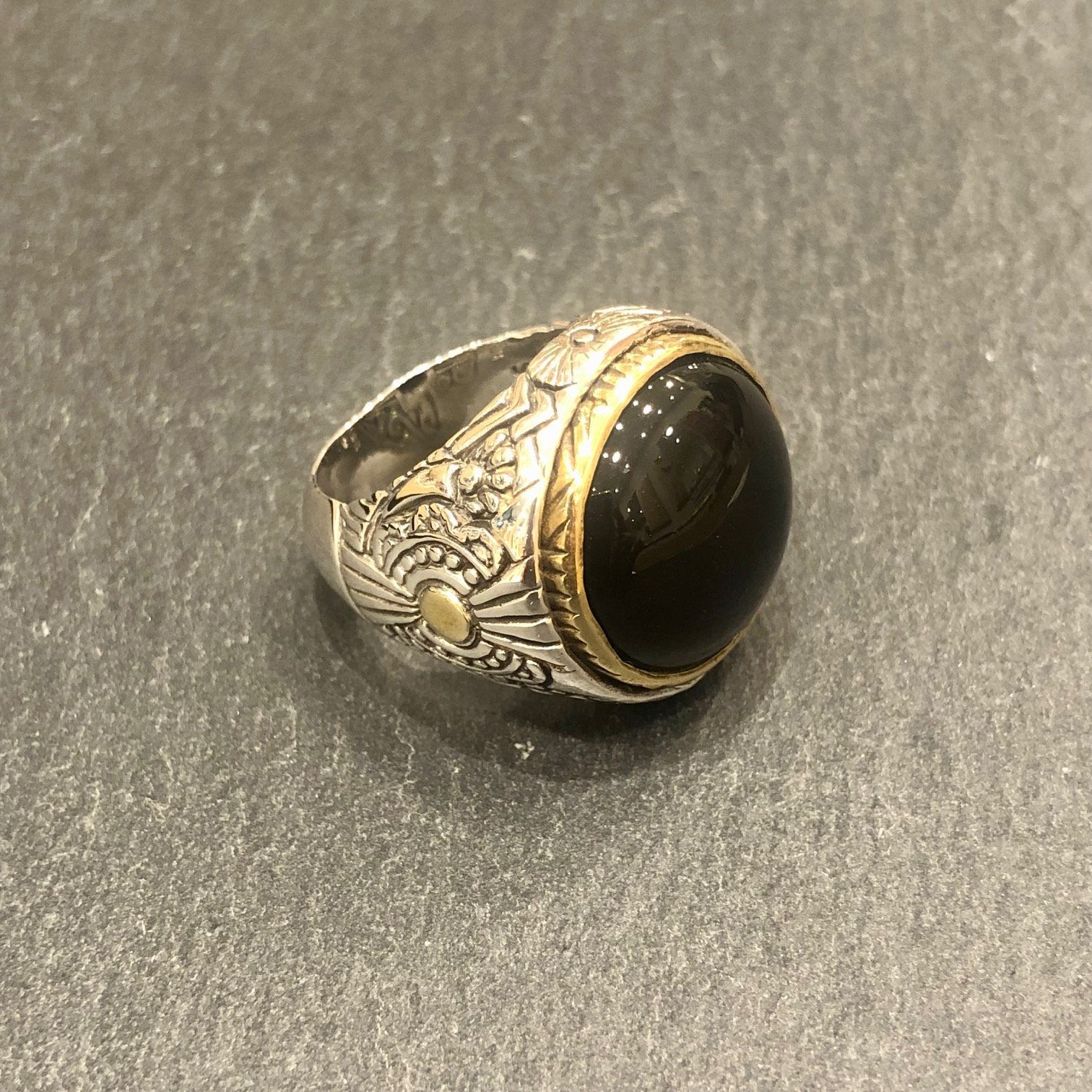 Bague en argent 925, sertie d une onyx, tour cuivre.