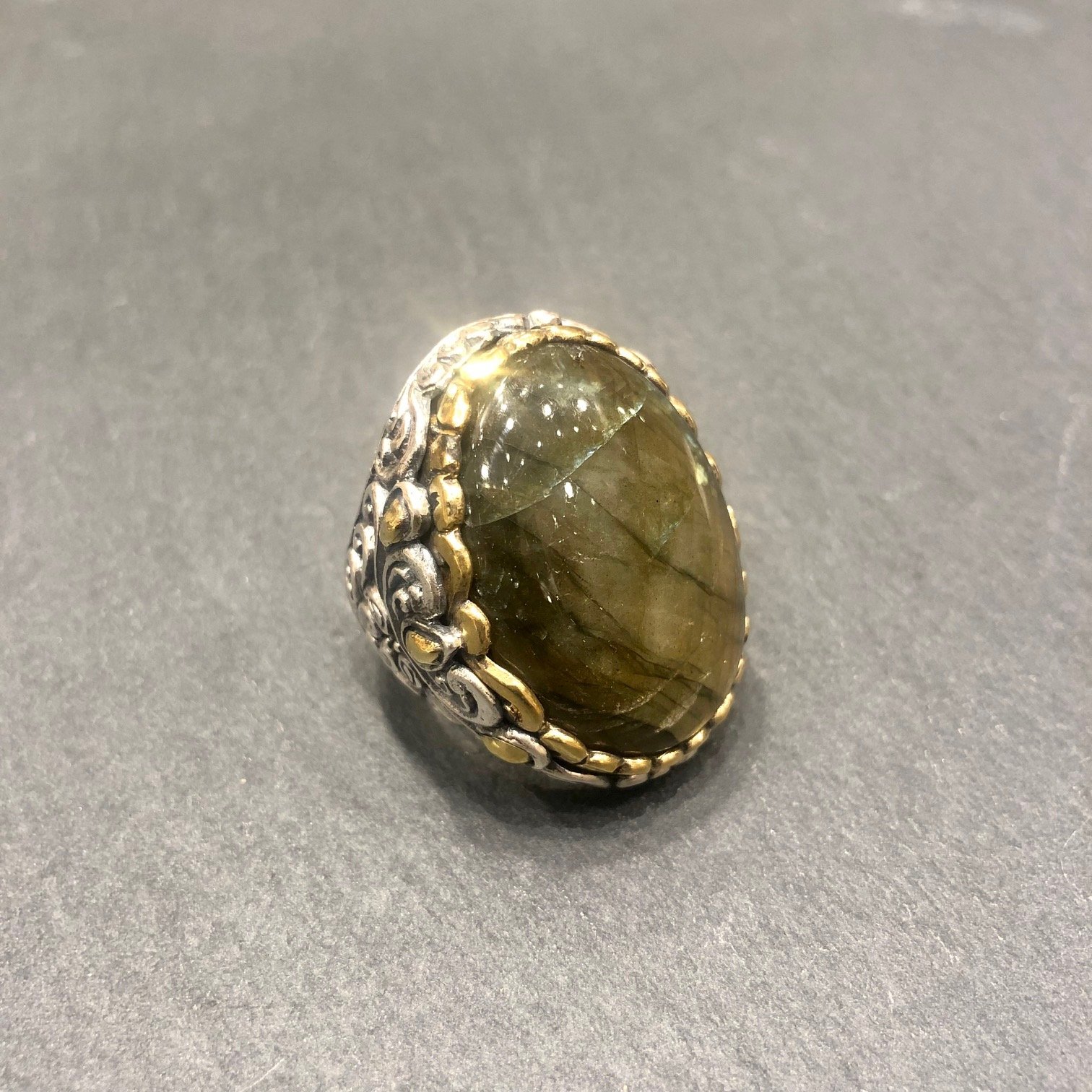 Bague en argent 925 sertie d une labradorite, tour serti cuivre.