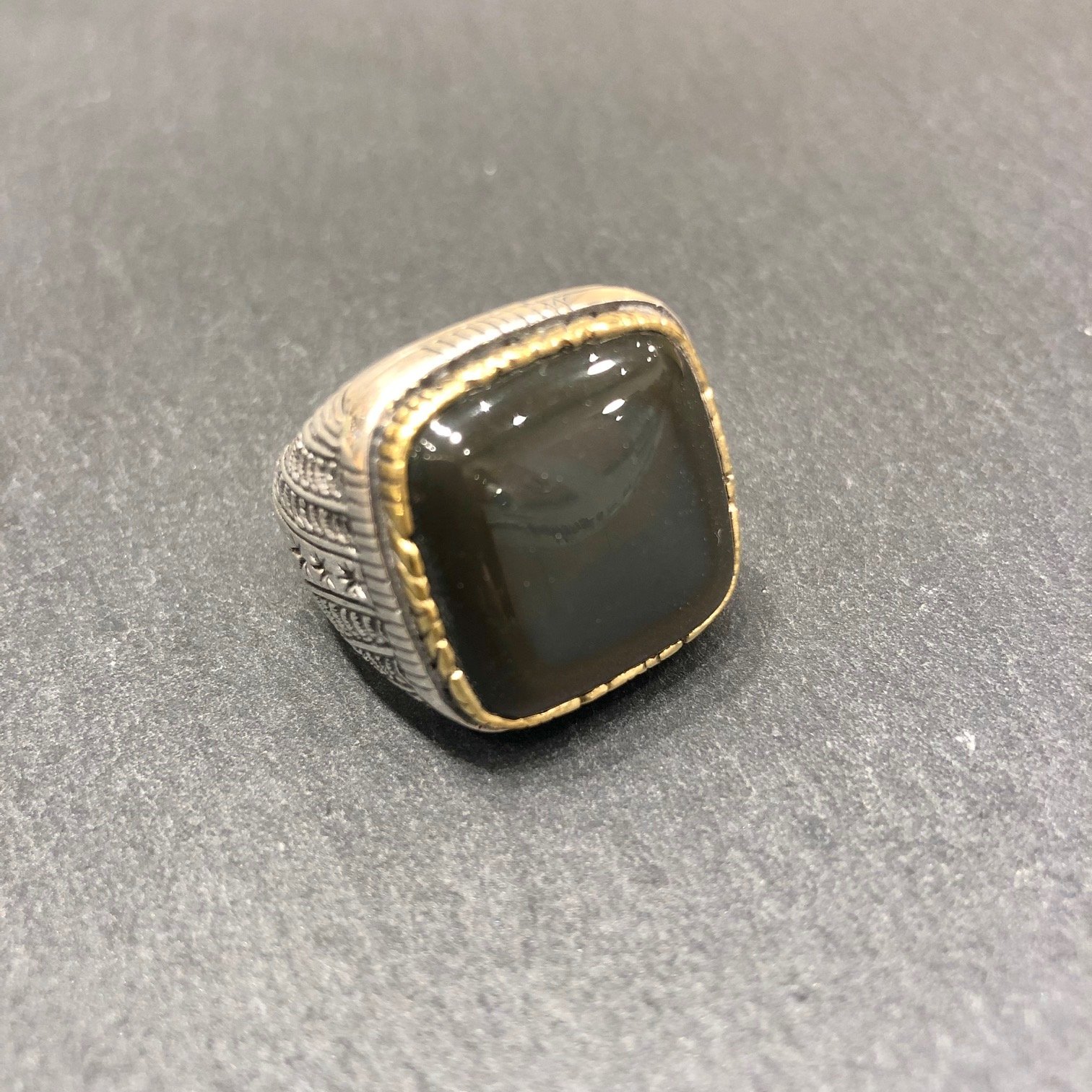 Bague en argent 925 sertie d une obsidienne, tour serti cuivre.