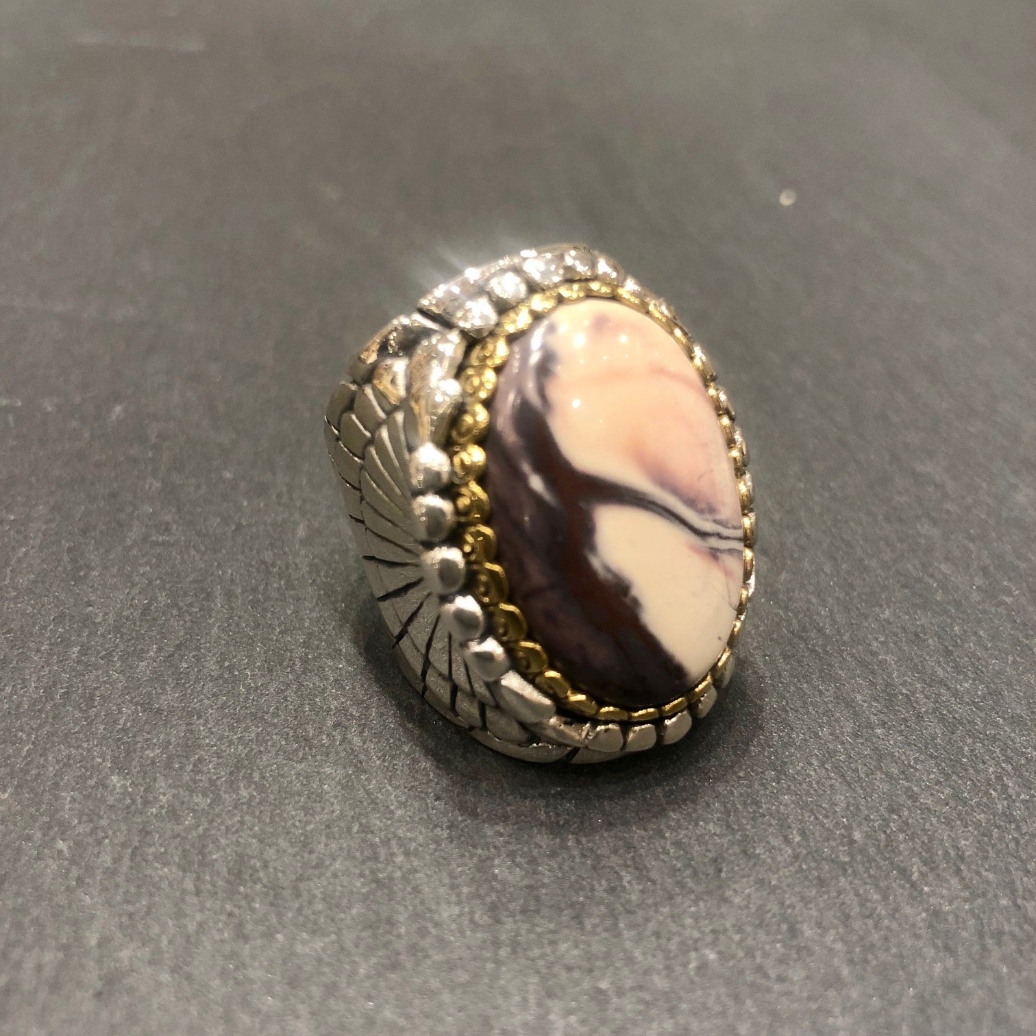 Bague en argent 925 sertie d une jaspe porcelaine, tour serti cuivre.