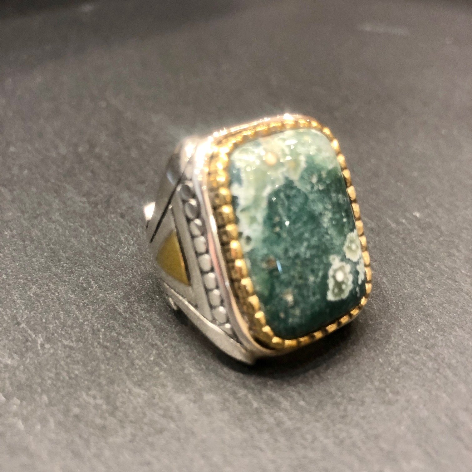 Bague en argent 925 sertie d une Jaspe Océan , tour serti cuivre.