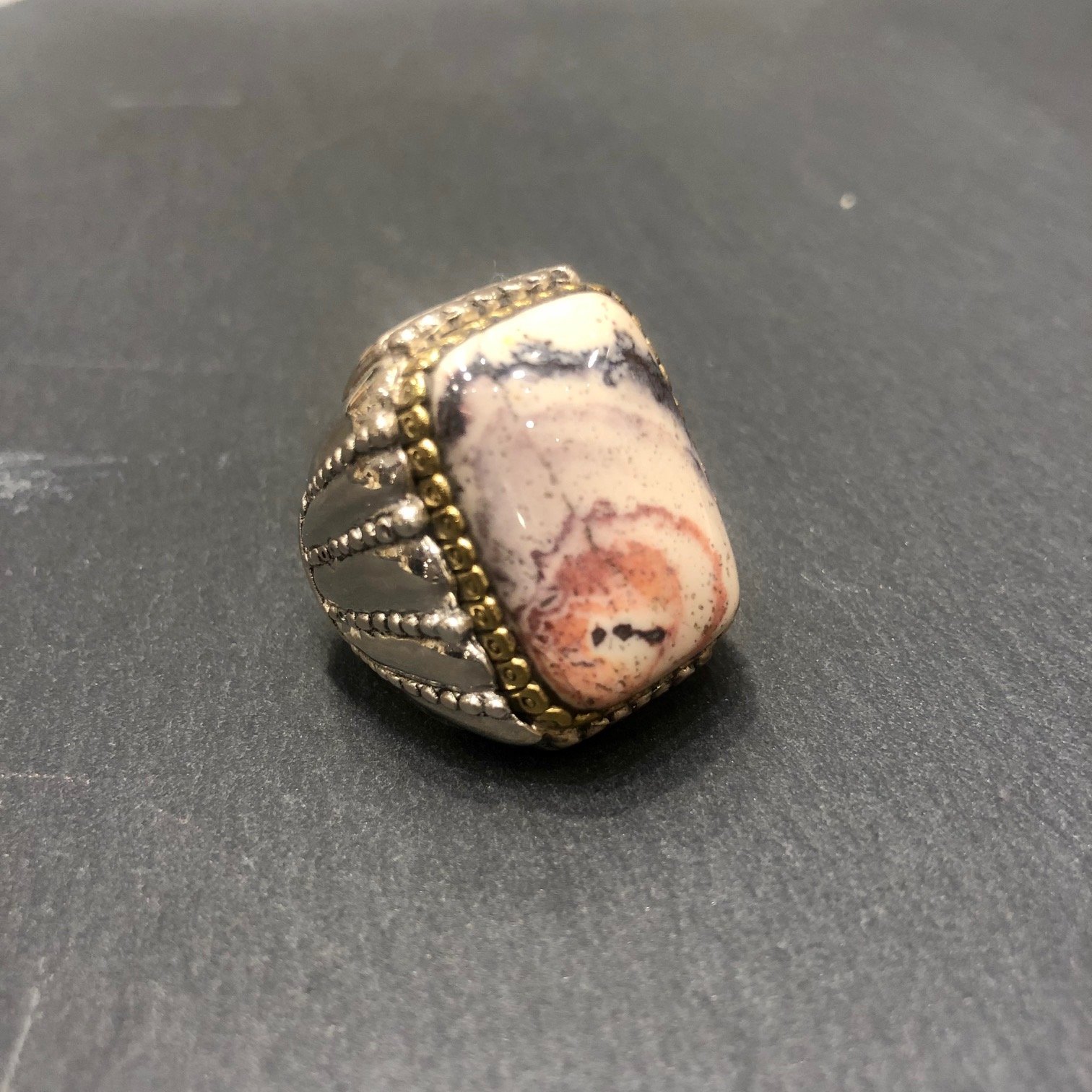 Bague en argent 925 sertie d une jaspe porcelaine, tour serti cuivre.