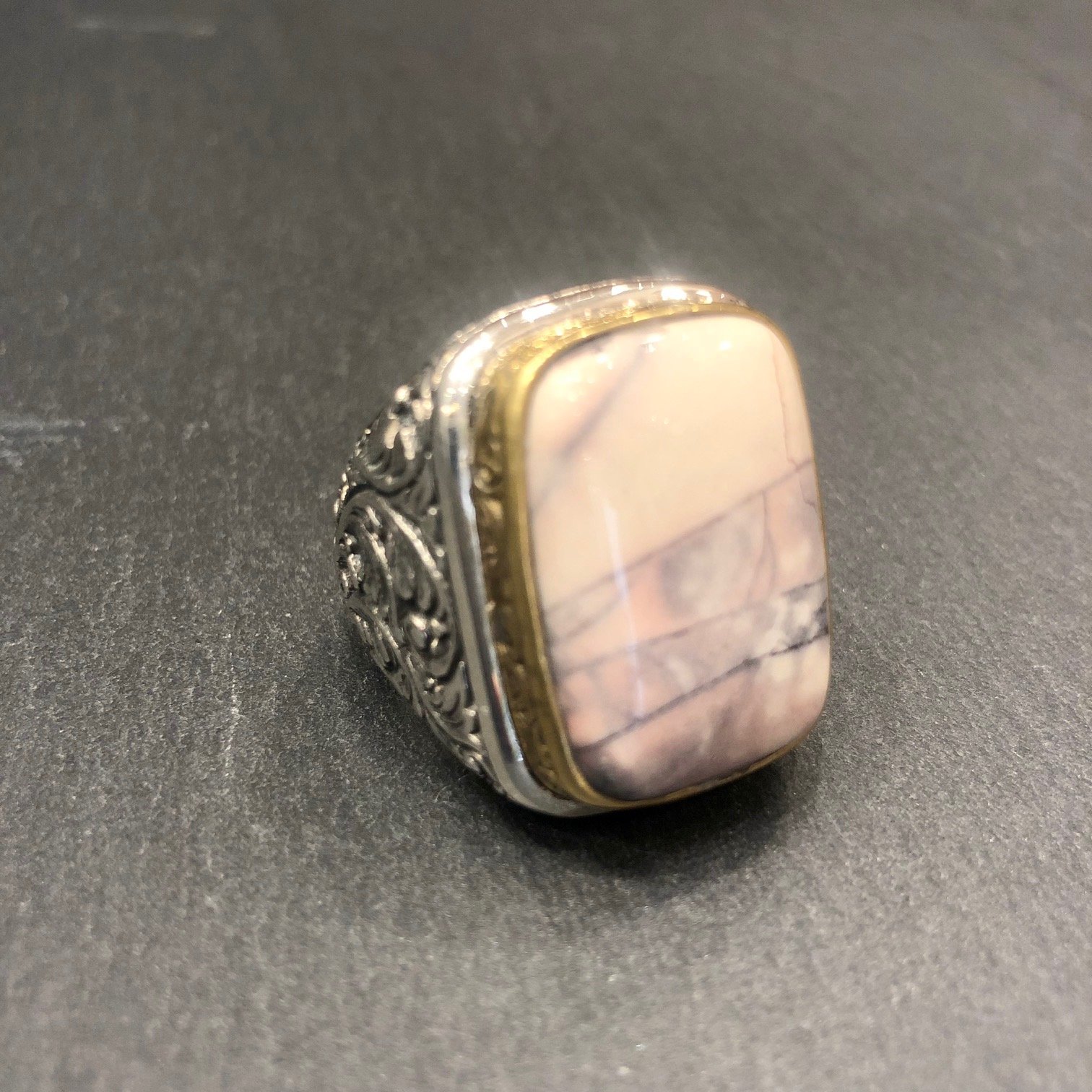 Bague en argent 925 sertie d une jaspe porcelaine, tour serti cuivre.