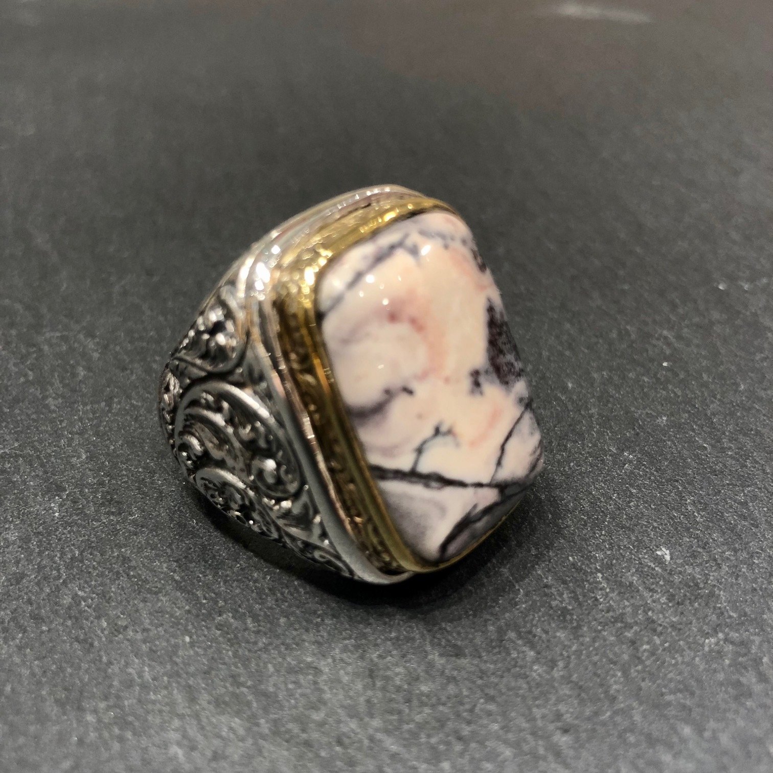 Bague en argent 925 sertie d une jaspe porcelaine, tour serti cuivre.