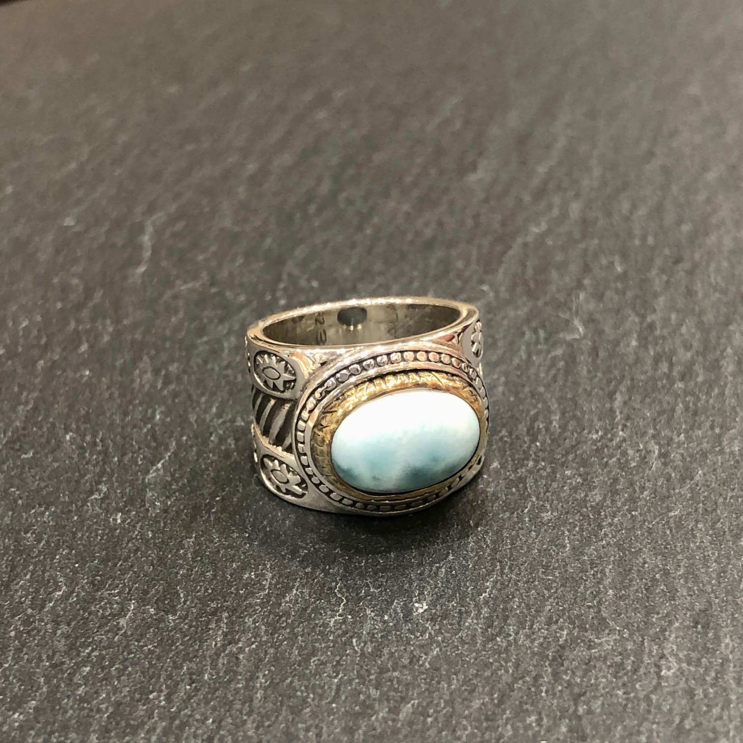 Bague en argent 925,sertie d’une larimar, tour cuivre .