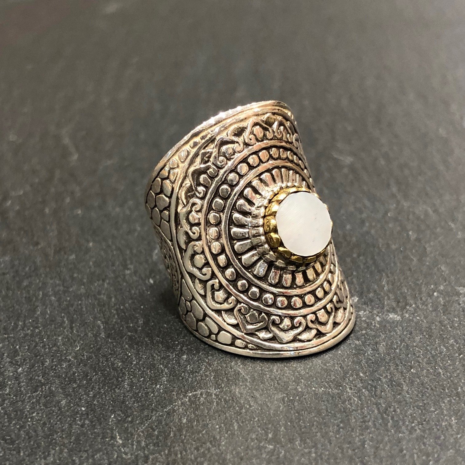 Bague en argent 925,sertie d’une nacre, tour cuivre .