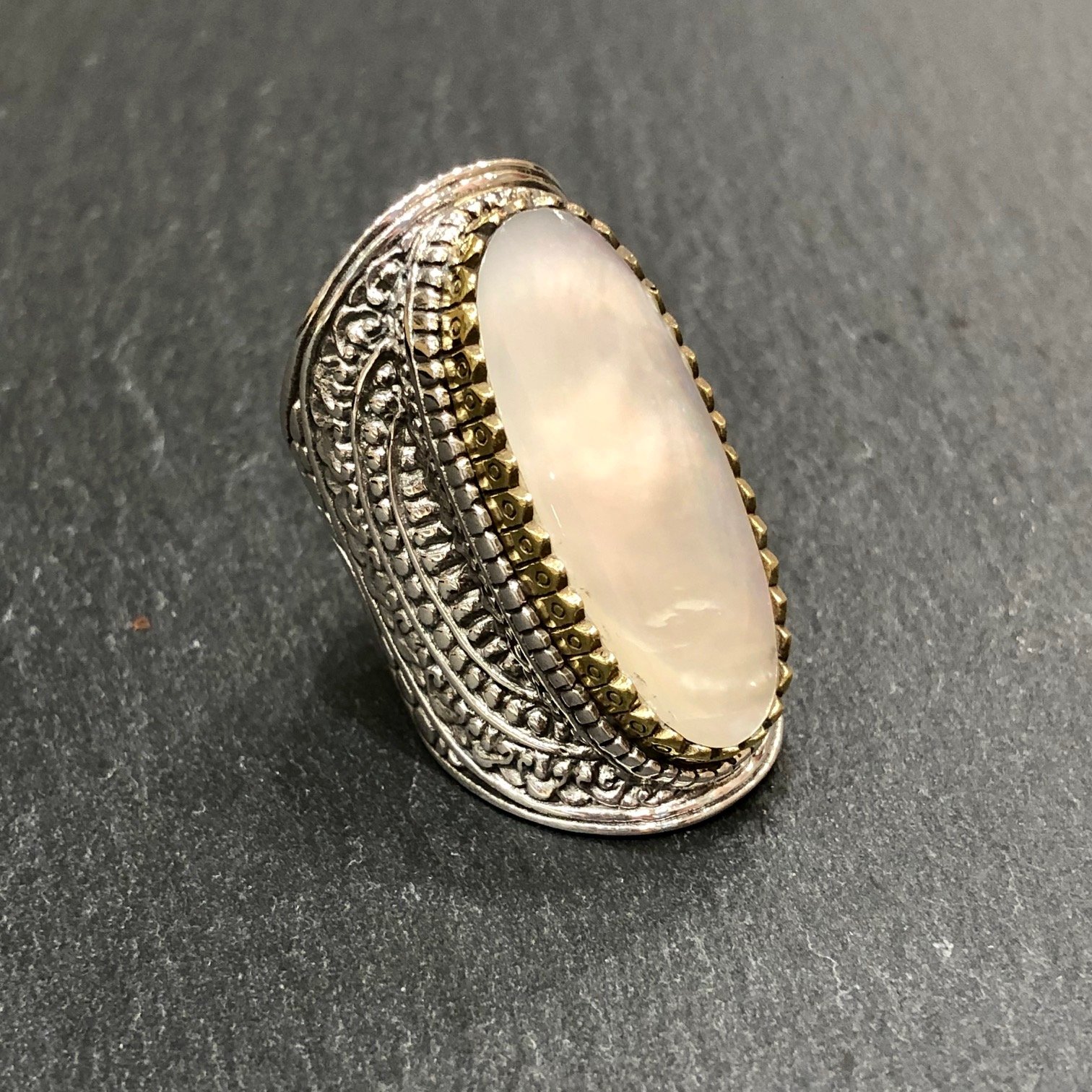 Bague en argent 925 série d’une nacre, sertie cuivre.
