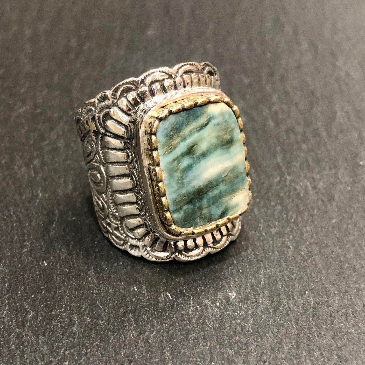Bague en argent 925,sertie d’un coquillage vert, tour cuivre .