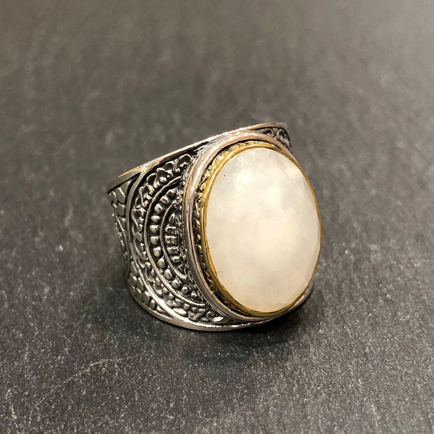 Bague en argent 925,sertie d’une pierre de lune facettée, tour cuivre .
