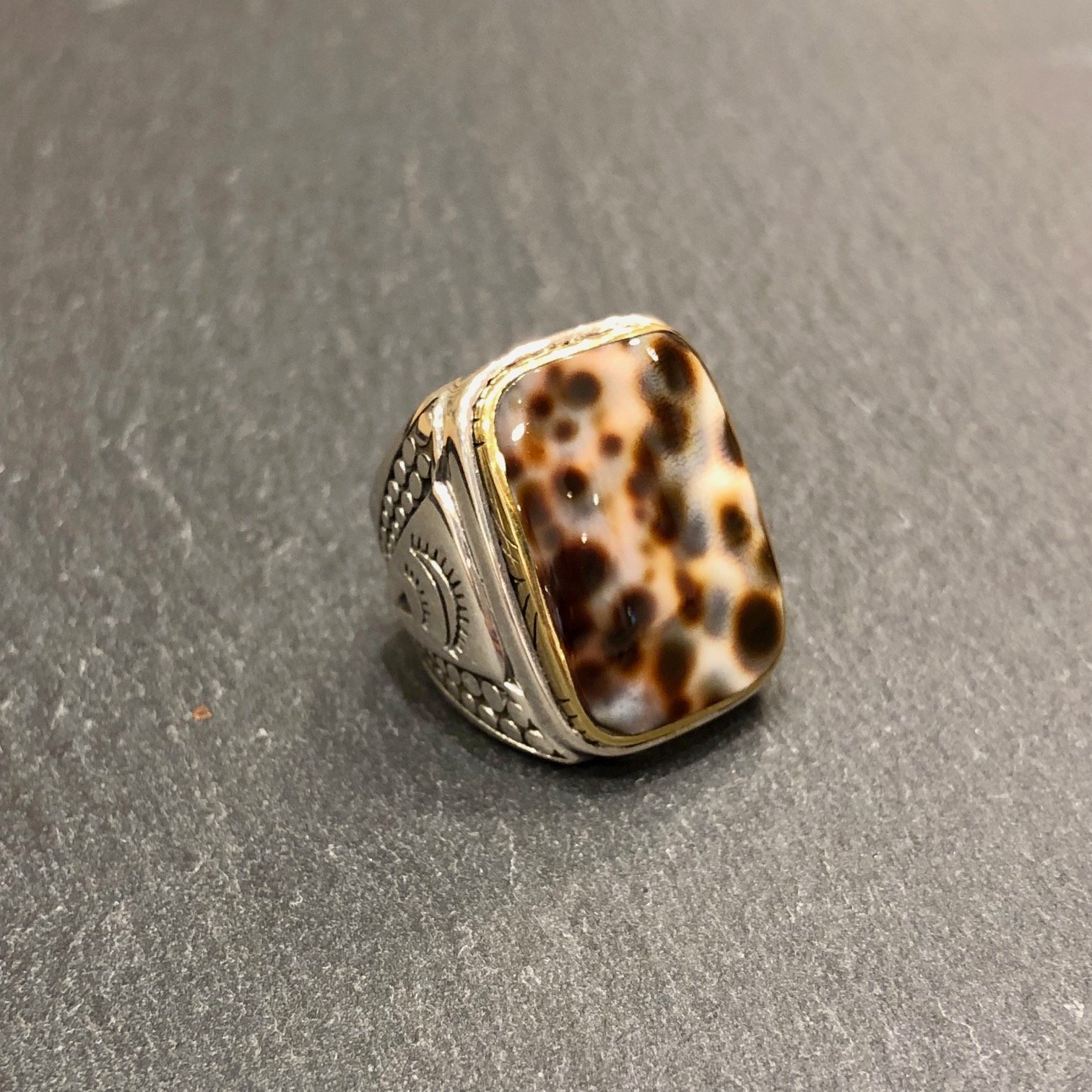 Bague en argent 925 série d’une porcelaine tigre, sertie cuivre.