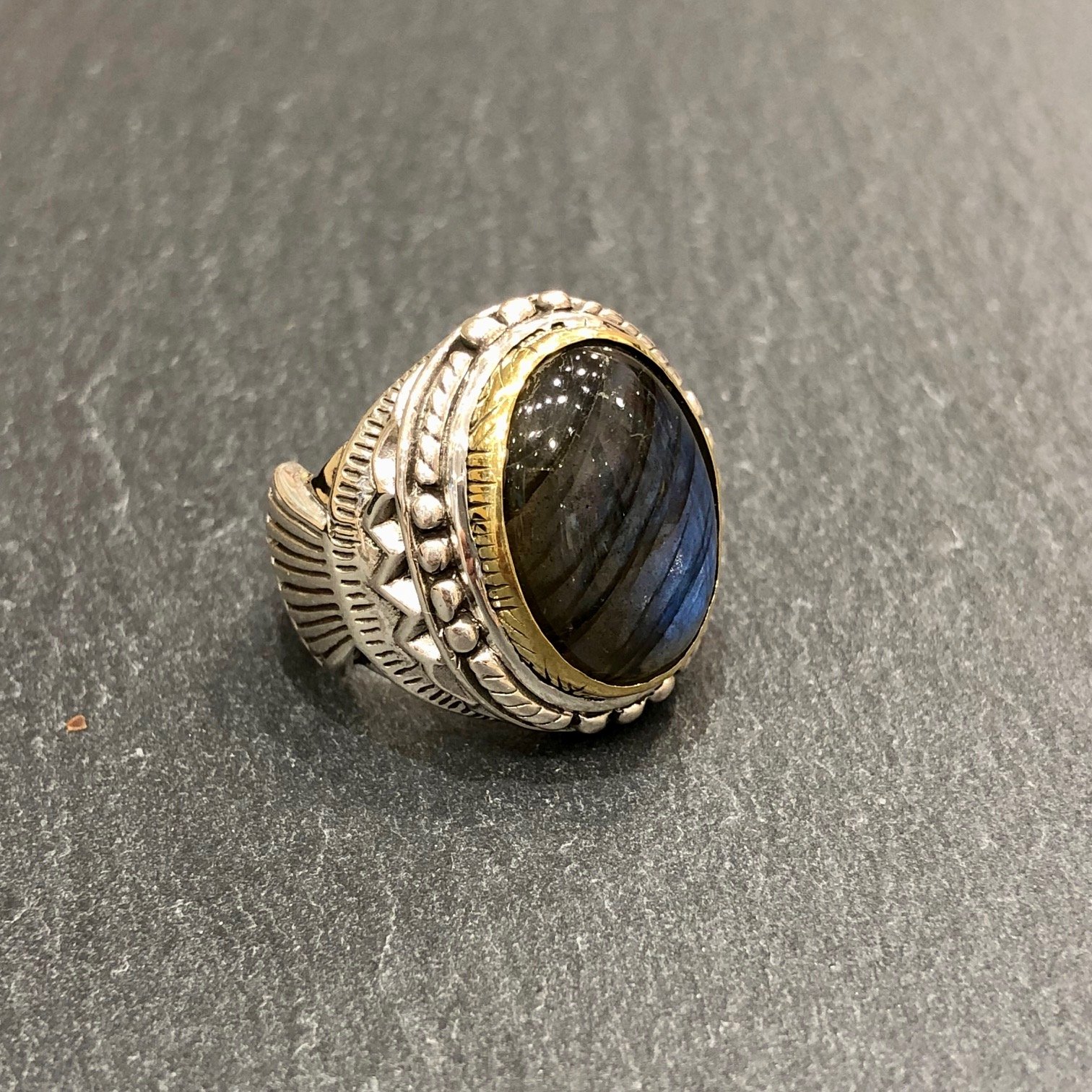 Bague en argent 925 série d’une labradorite , sertie cuivre.
