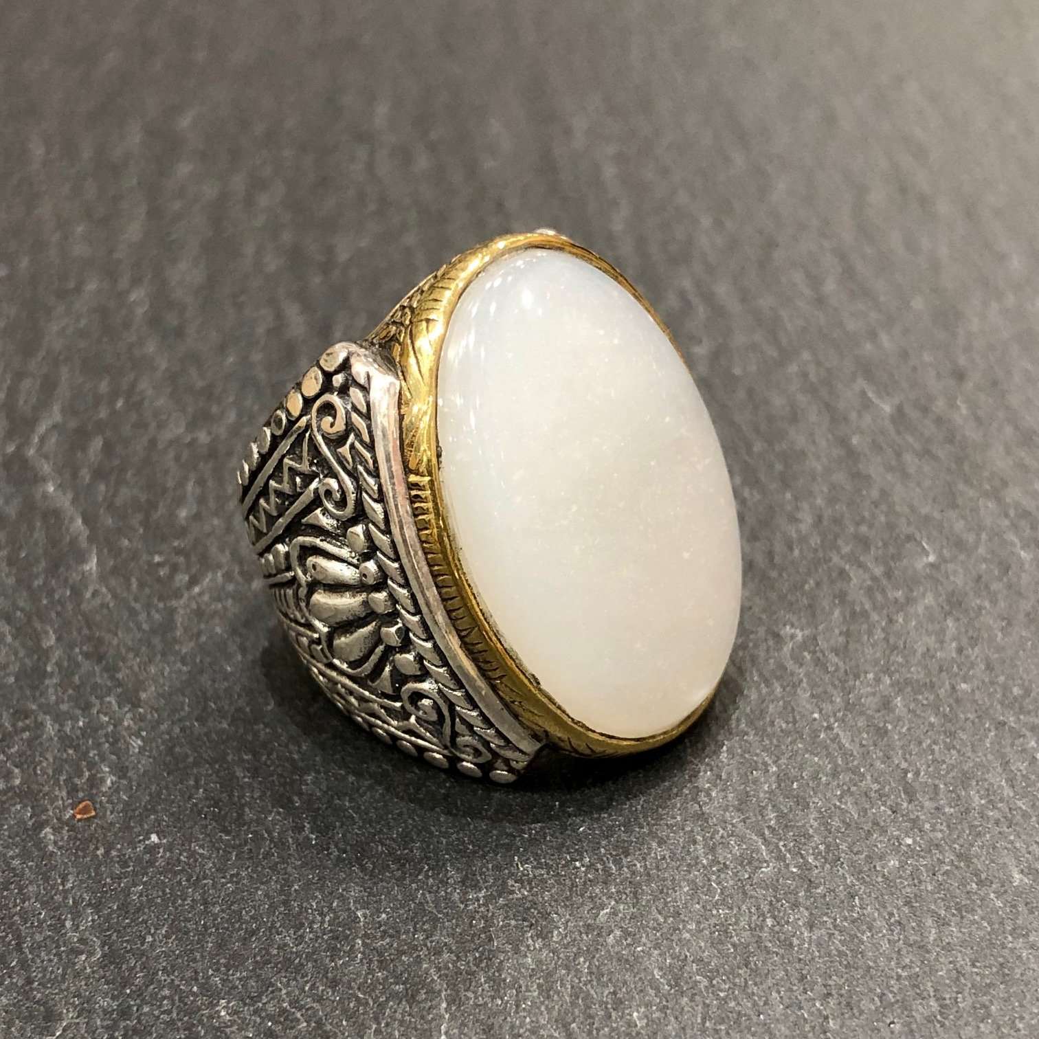 Bague en argent 925 série d’une pierre de lune, sertie cuivre.