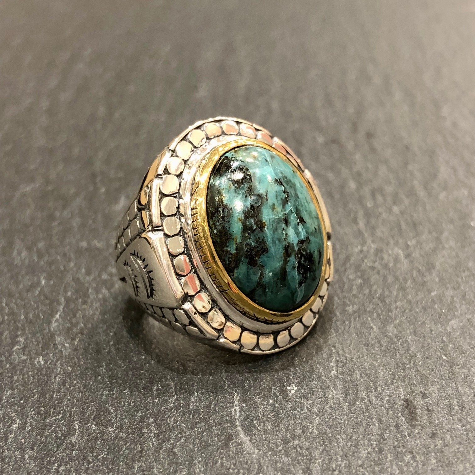 Bague en argent 925 série d’une turquoise africaine, sertie cuivre.