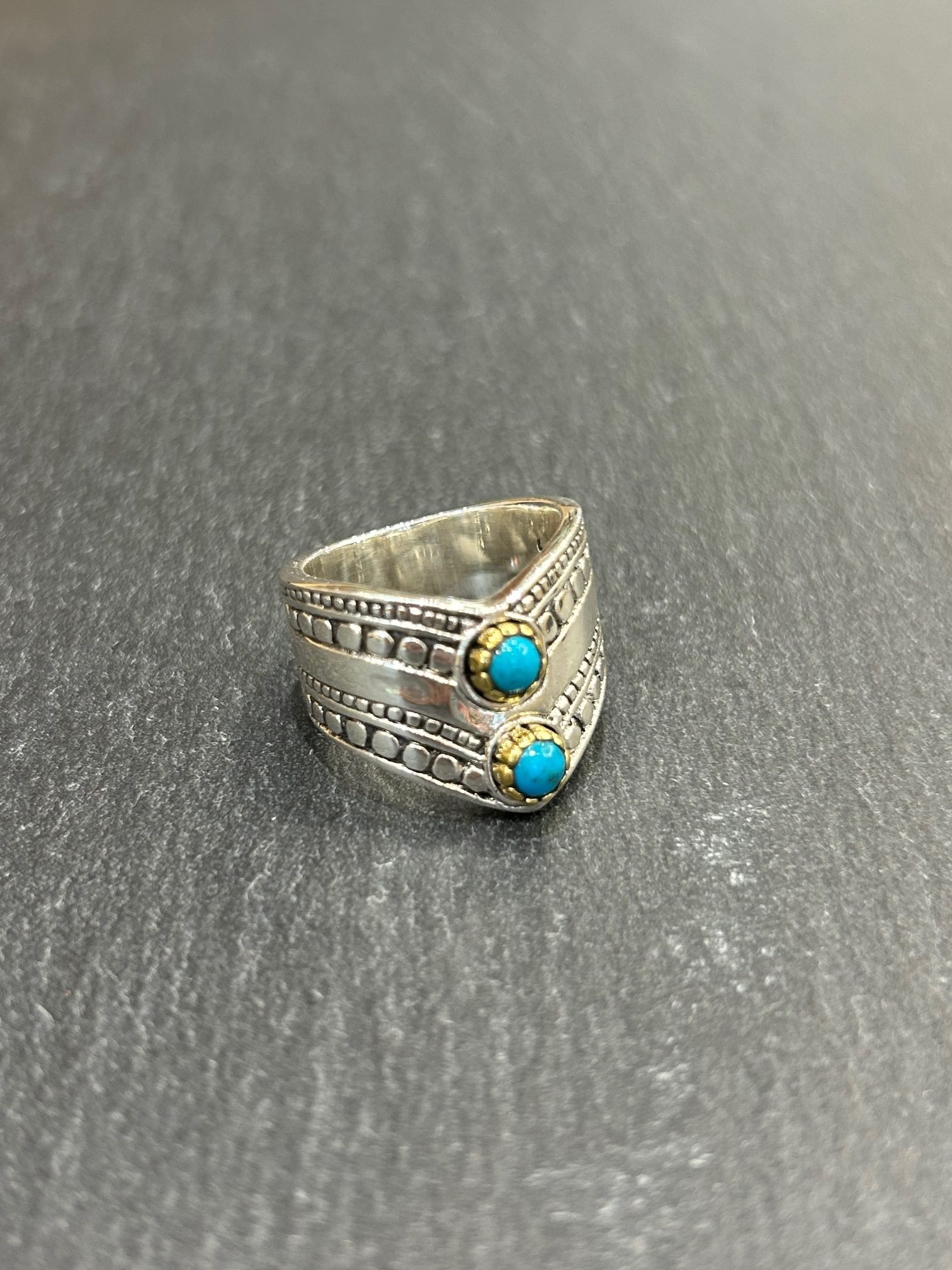 Bague en argent 925 sertie de 2 petites turquoise , sertie laiton.