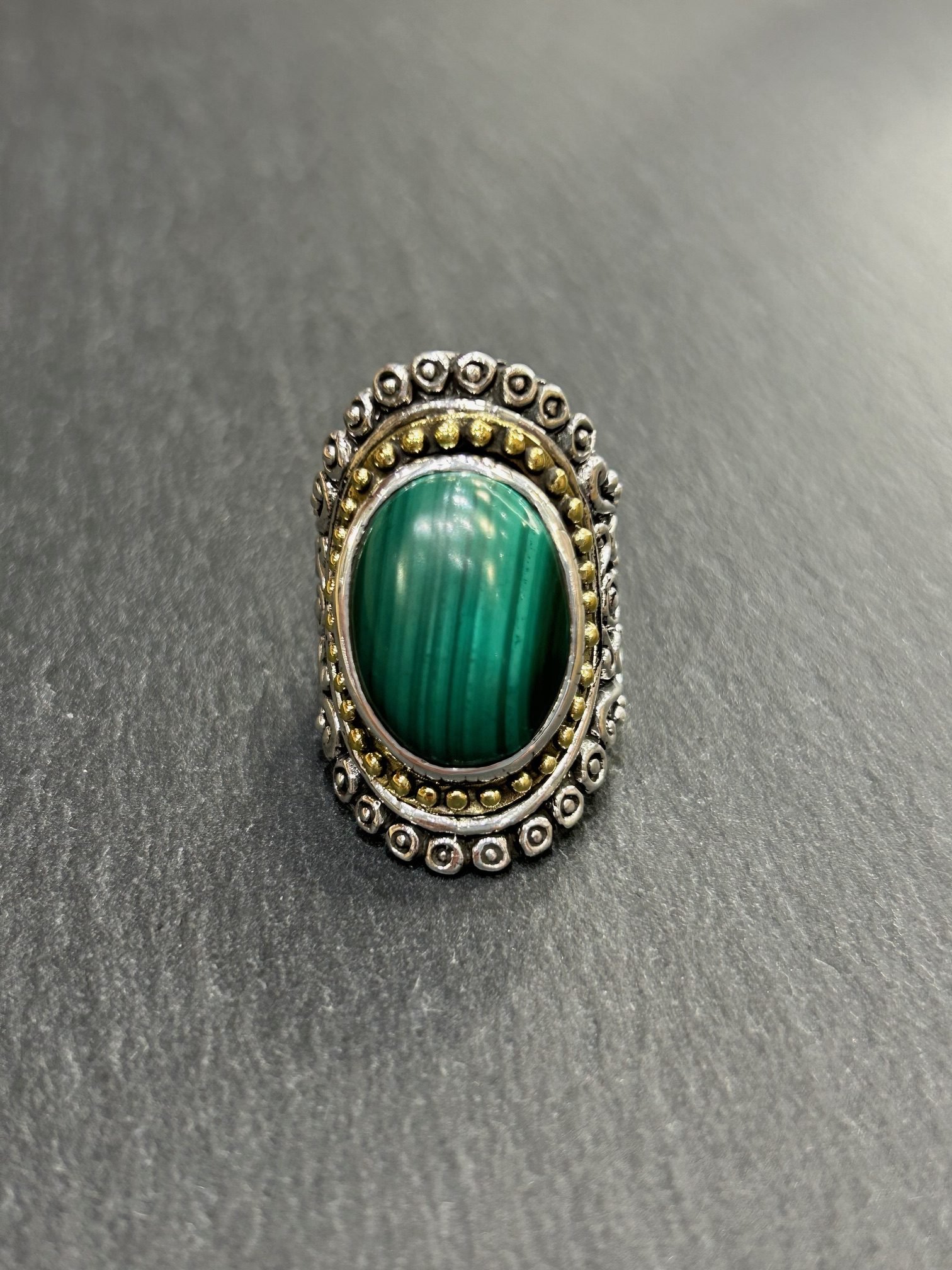 Bague en argent 925 sertie d’une Malachite d’Arizona, sertie laiton.