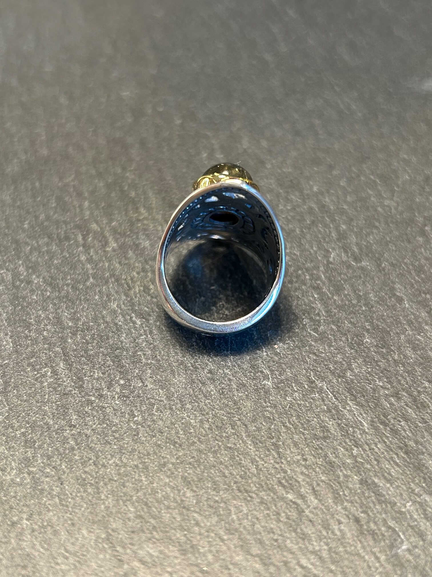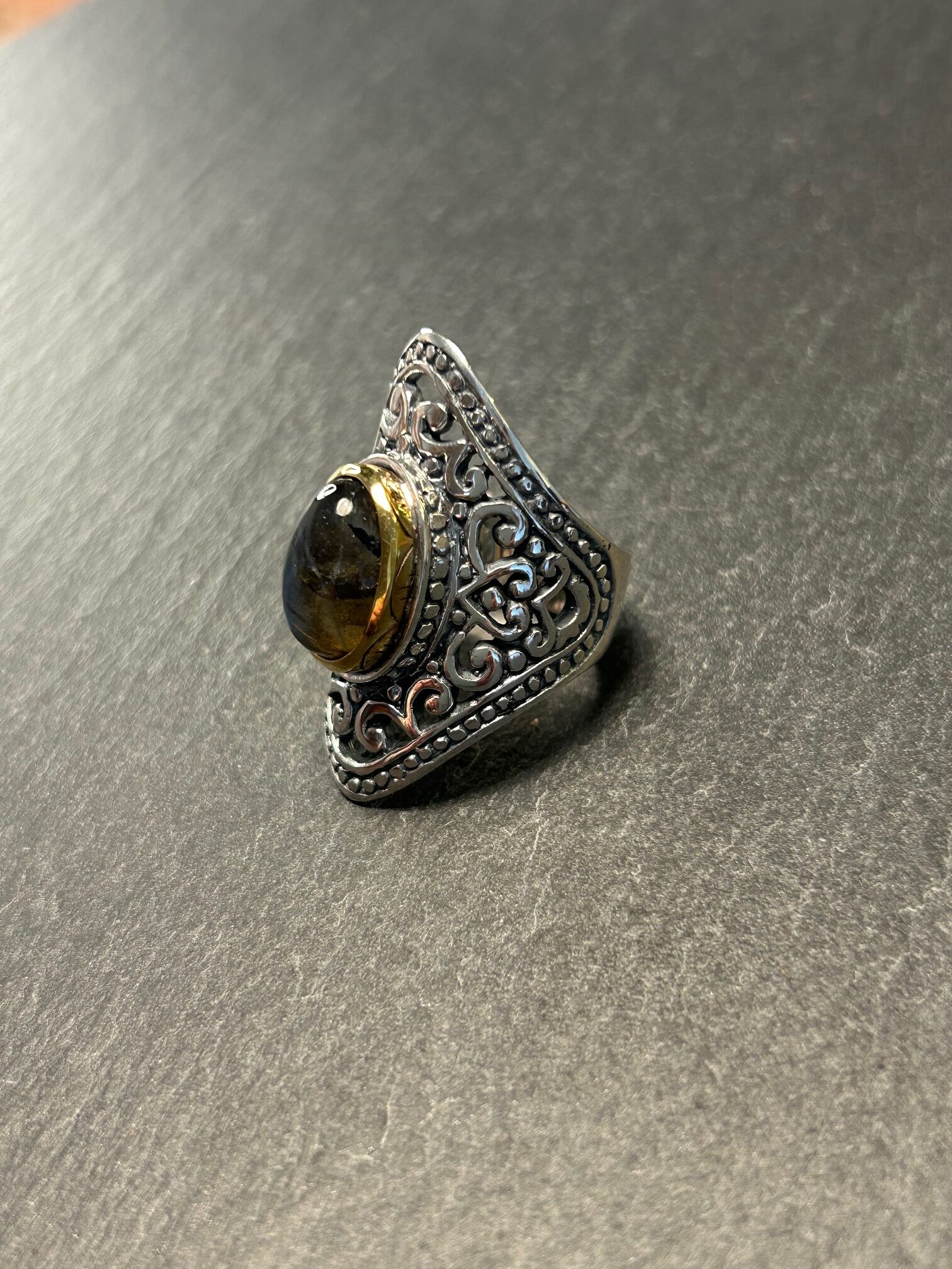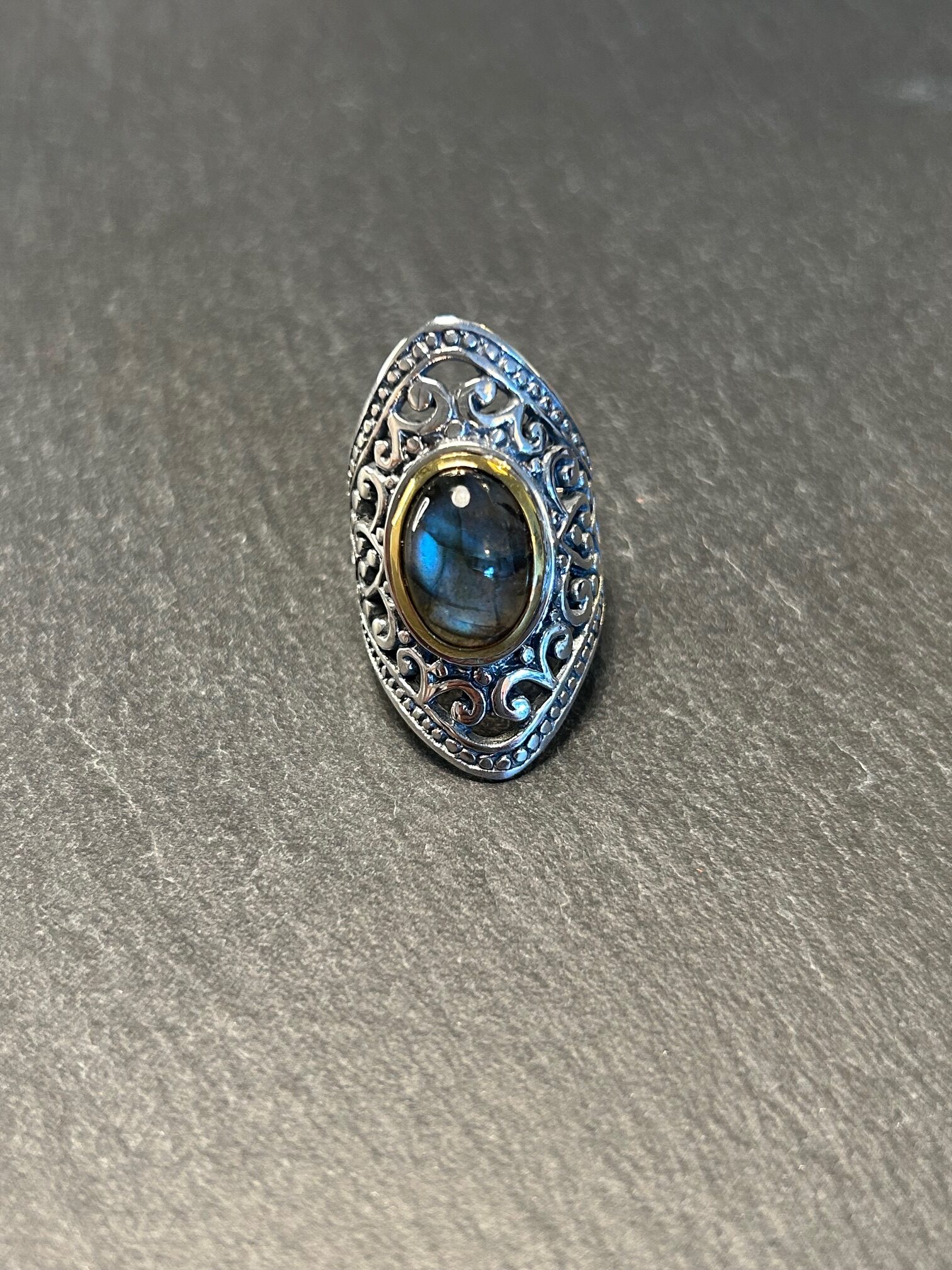 La monture en argent, finement dentelée, confère à ce bijou une allure sophistiquée sans ostentation. Par ailleurs, sa longueur de 3,8 cm sur le doigt allonge subtilement la main et souligne sa grâce naturelle. Le contraste entre le métal précieux et la pierre irisée crée un équilibre parfait entre modernité et tradition.
