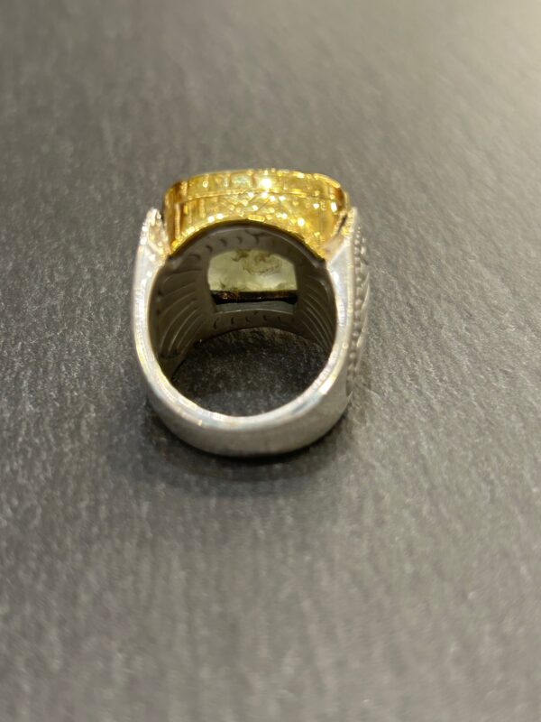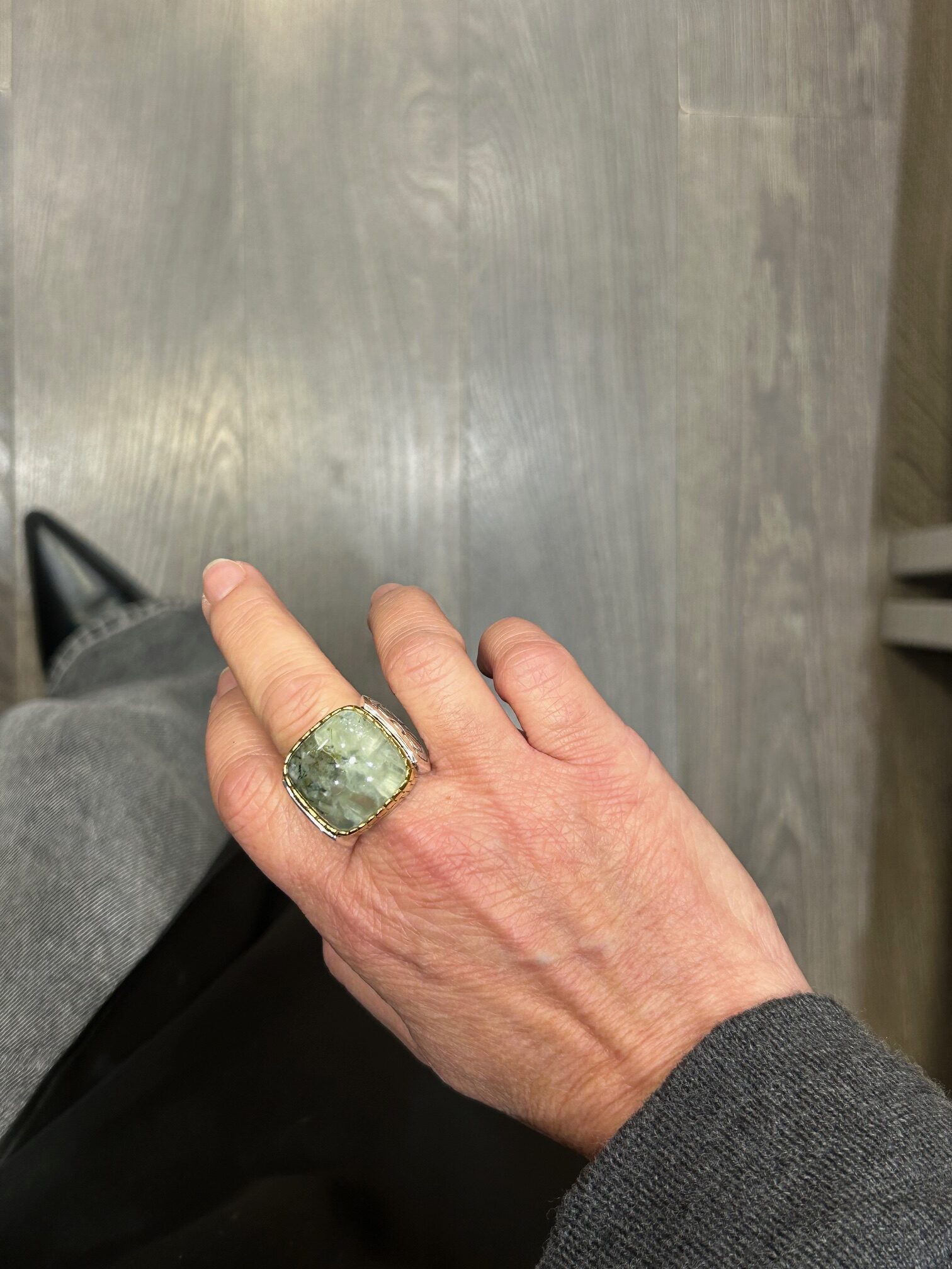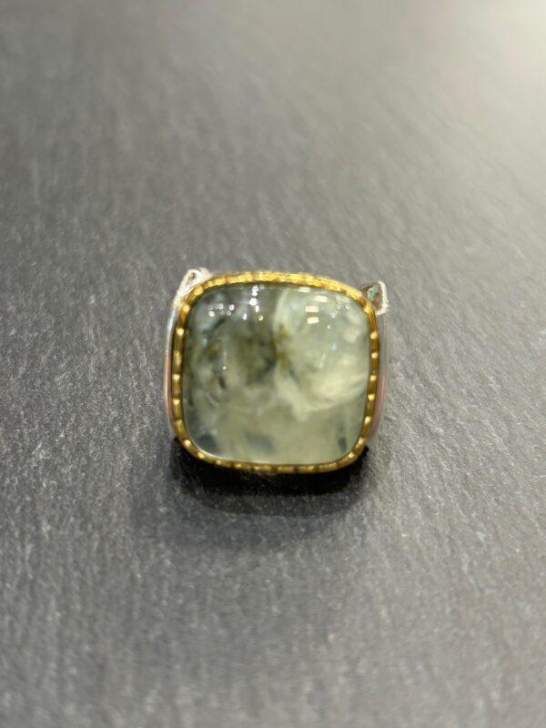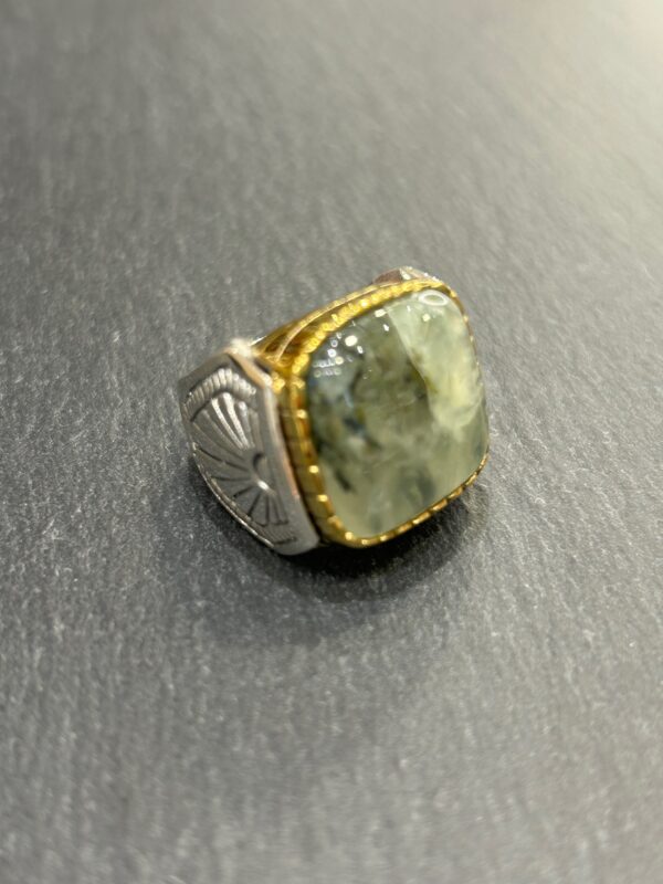 Par ailleurs, la phrénite se distingue par sa teinte douce, oscillant entre vert tendre et éclats translucides. Elle évoque la sérénité et la lumière intérieure. De plus, sa surface lisse capte chaque reflet, offrant à la bague un charme changeant selon l’angle et la lumière. Enfin, son association avec l’argent pur renforce cette impression d’élégance intemporelle.
