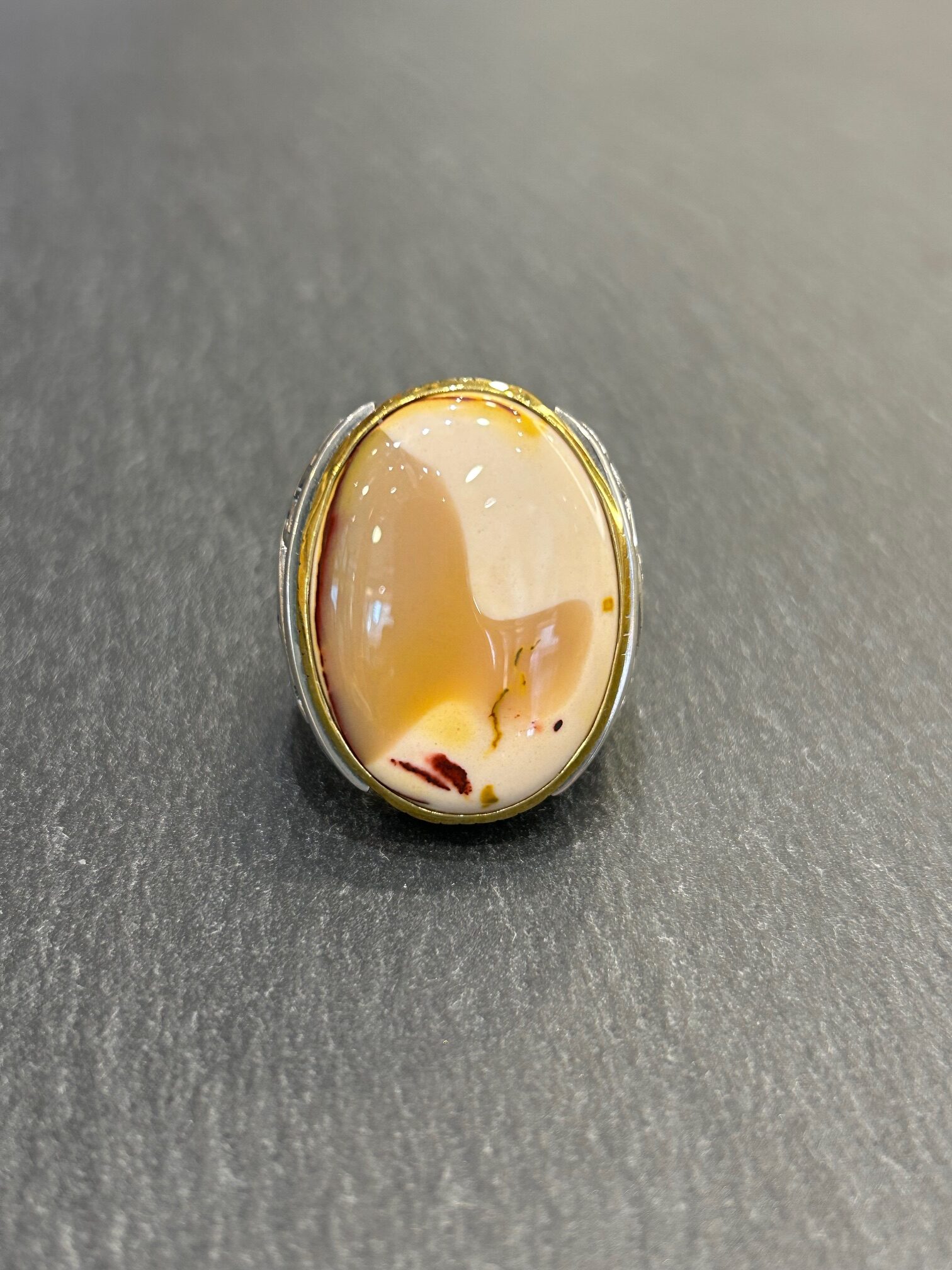 Sertie de laiton doré et montée sur une base en argent 925, cette bague conjugue éclat et contraste. Ainsi, le métal précieux souligne la pierre tout en renforçant sa luminosité naturelle. Par ailleurs, sa pierre ovale de 3 cm par 2,2 cm attire le regard sans ostentation. Elle habille la main avec élégance, tout en conservant une allure moderne et organique.