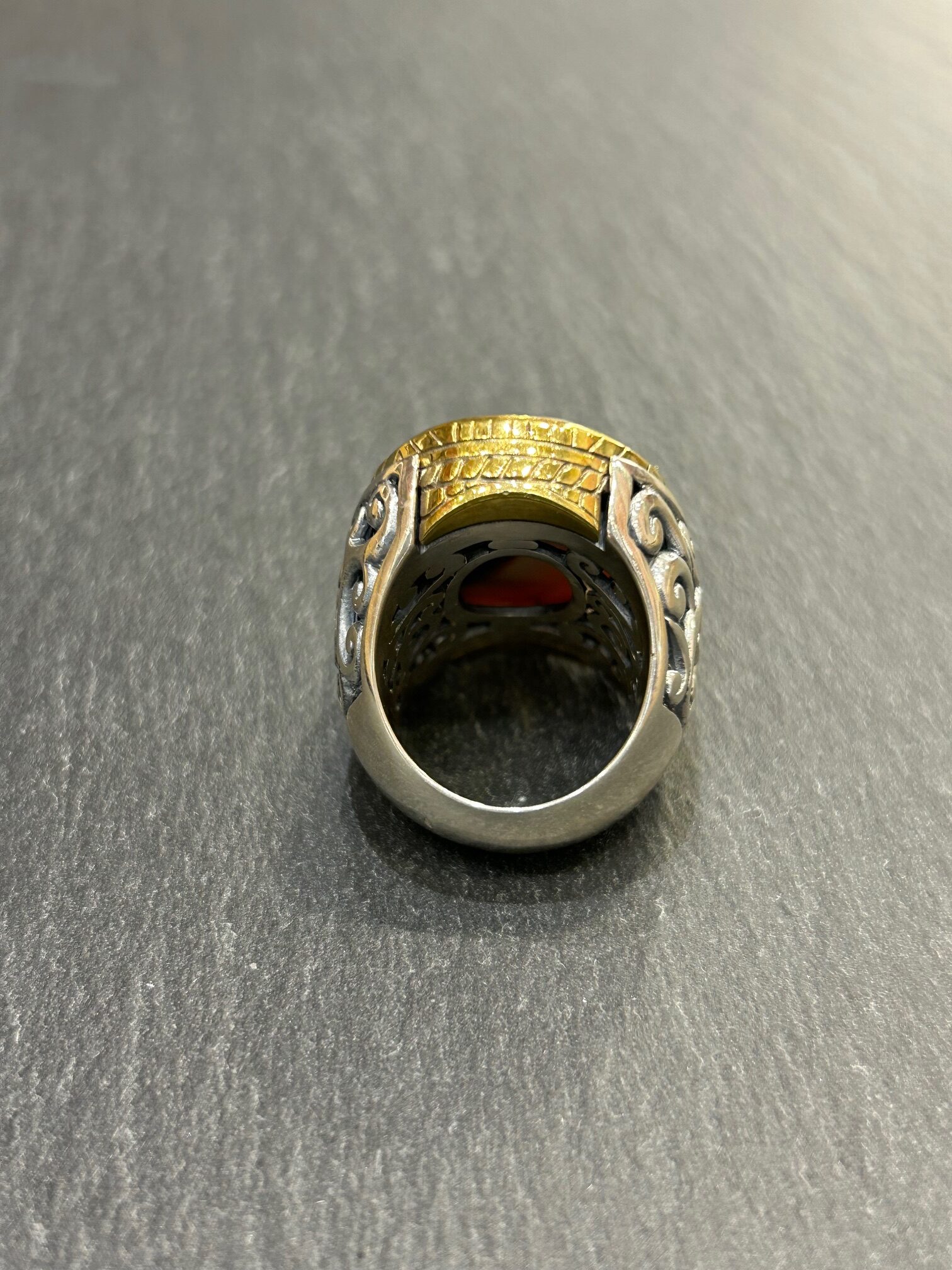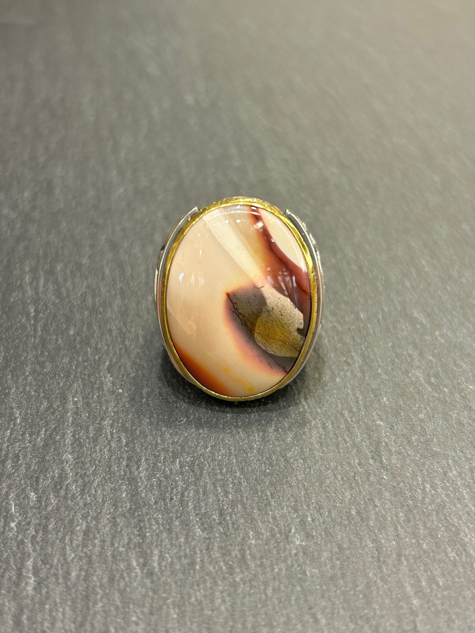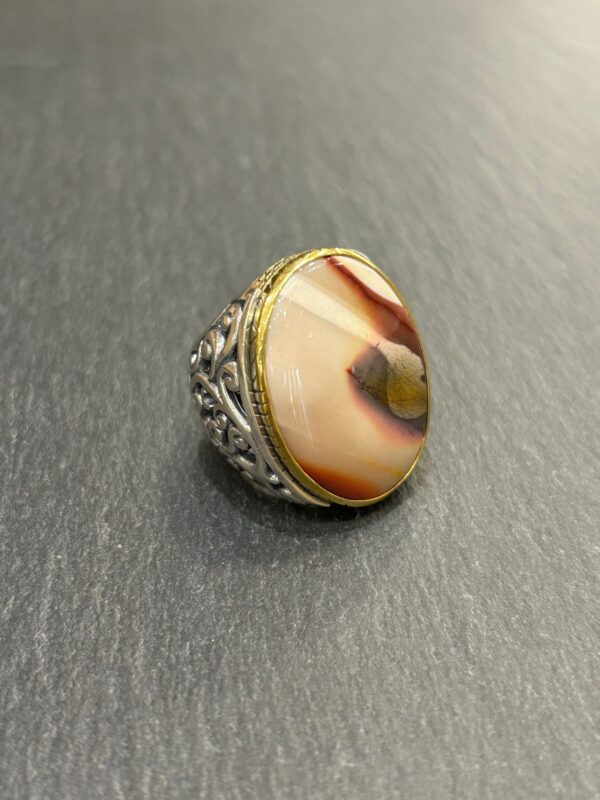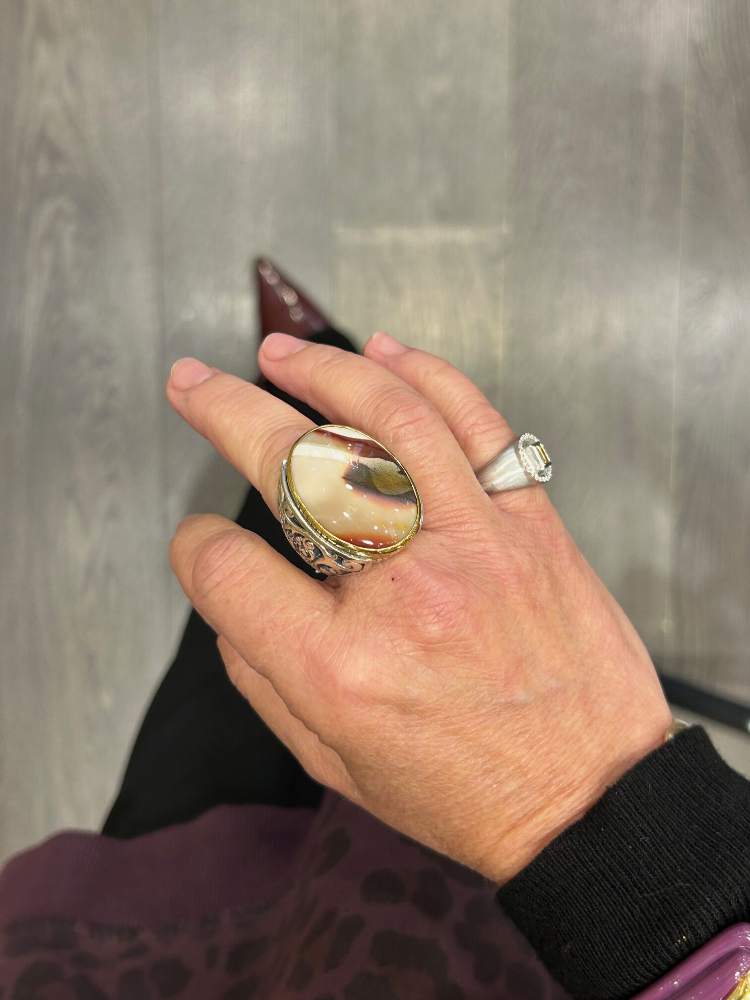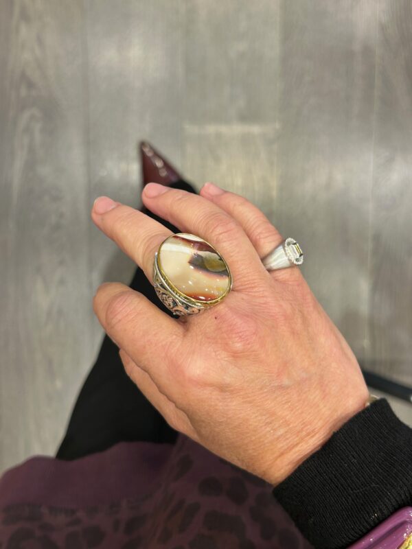 Sa pierre ovale de 3 cm sur 2,3 cm attire le regard, tandis que sa monture en argent poli souligne la richesse de ses teintes. Ainsi, chaque reflet de lumière révèle une nuance différente, du beige doux au bordeaux intense. Cette bague habille la main avec grâce, tout en affirmant une personnalité affirmée et élégante.