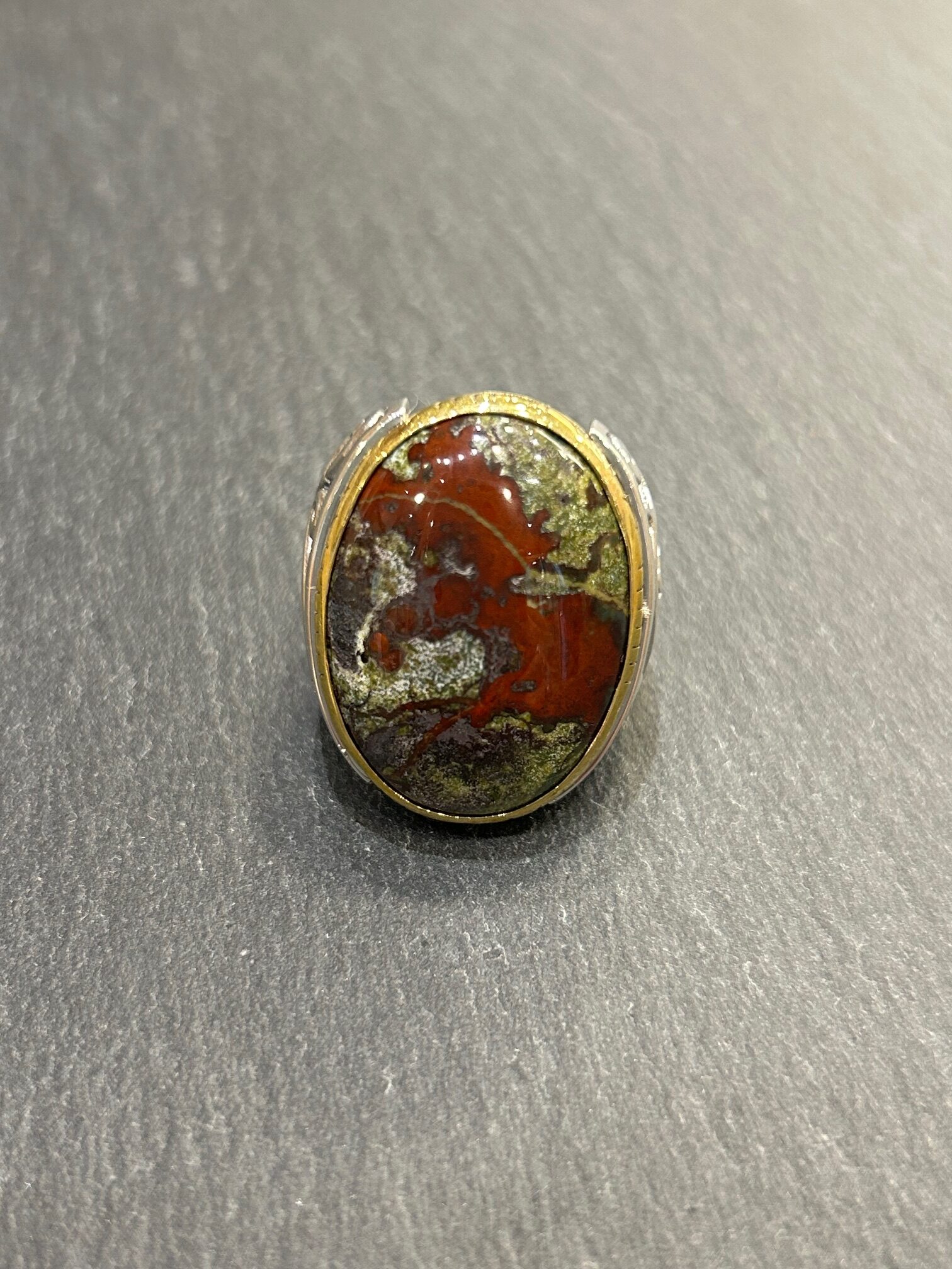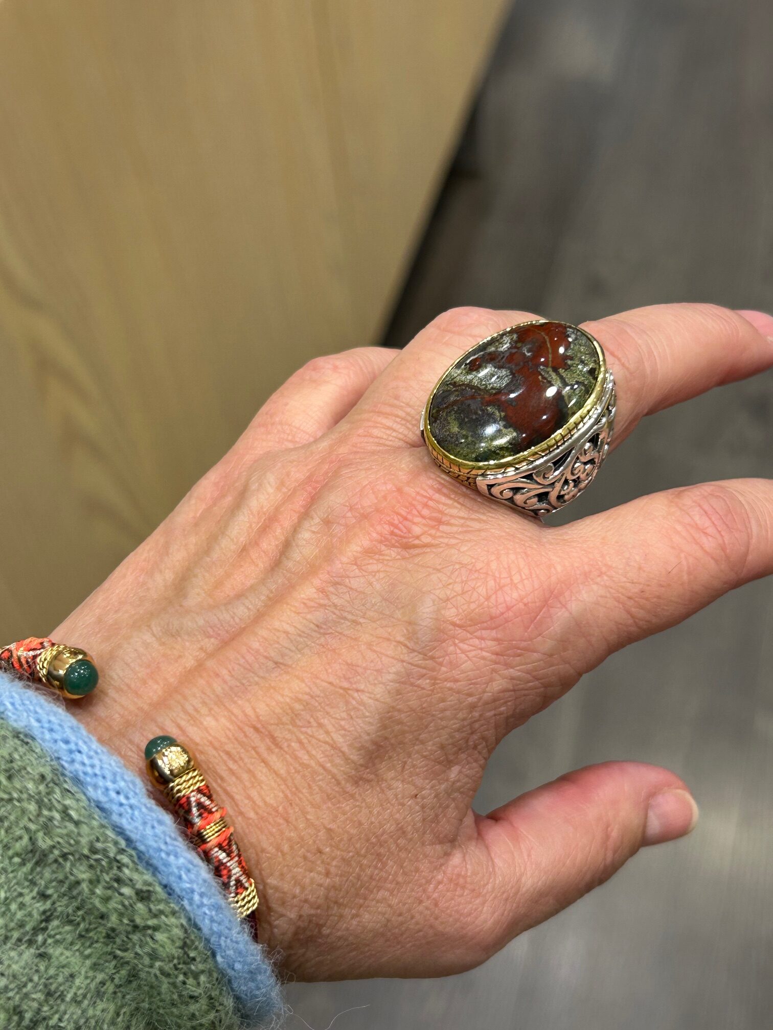 Dès le premier regard, la pierre Sang du dragon fascine. Ses nuances intenses rappellent une force ancestrale. Ainsi, cette bague ne se contente pas d’orner : elle raconte une histoire de puissance et de mystère. L’argent travaillé à la main révèle des détails délicats qui encadrent la gemme avec finesse. De plus, le serti en laiton apporte une chaleur dorée qui sublime l’ensemble.