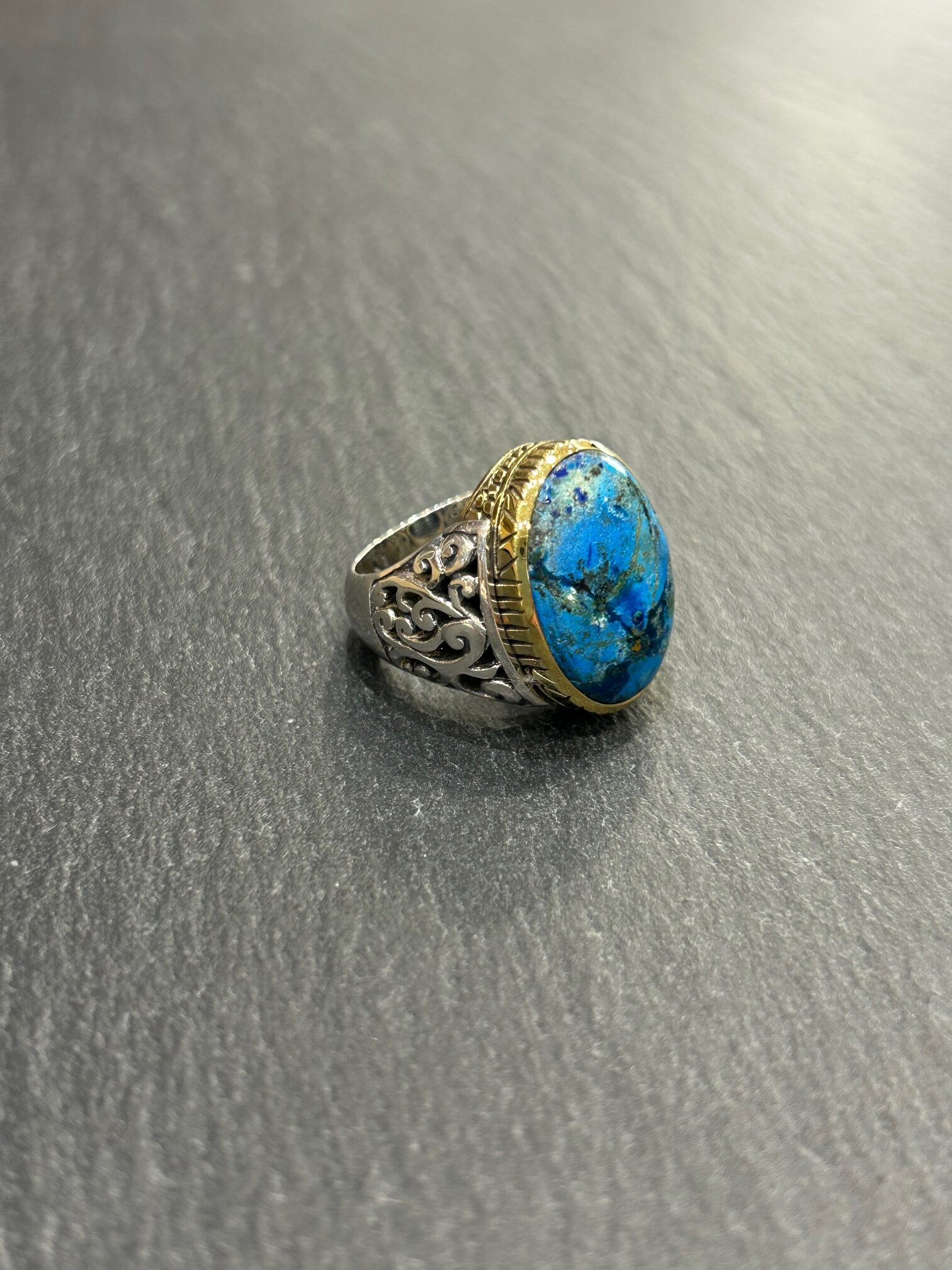 De plus, la bague s’adapte aisément à toutes les tenues, qu’il s’agisse d’une robe légère ou d’un ensemble plus habillé. Sa silhouette allongée (2 cm sur le doigt) affine la main et souligne la grâce du geste. Par ailleurs, la présence du laiton autour de l’azurite ajoute une note solaire à l’ensemble, rehaussant la brillance du bleu profond.