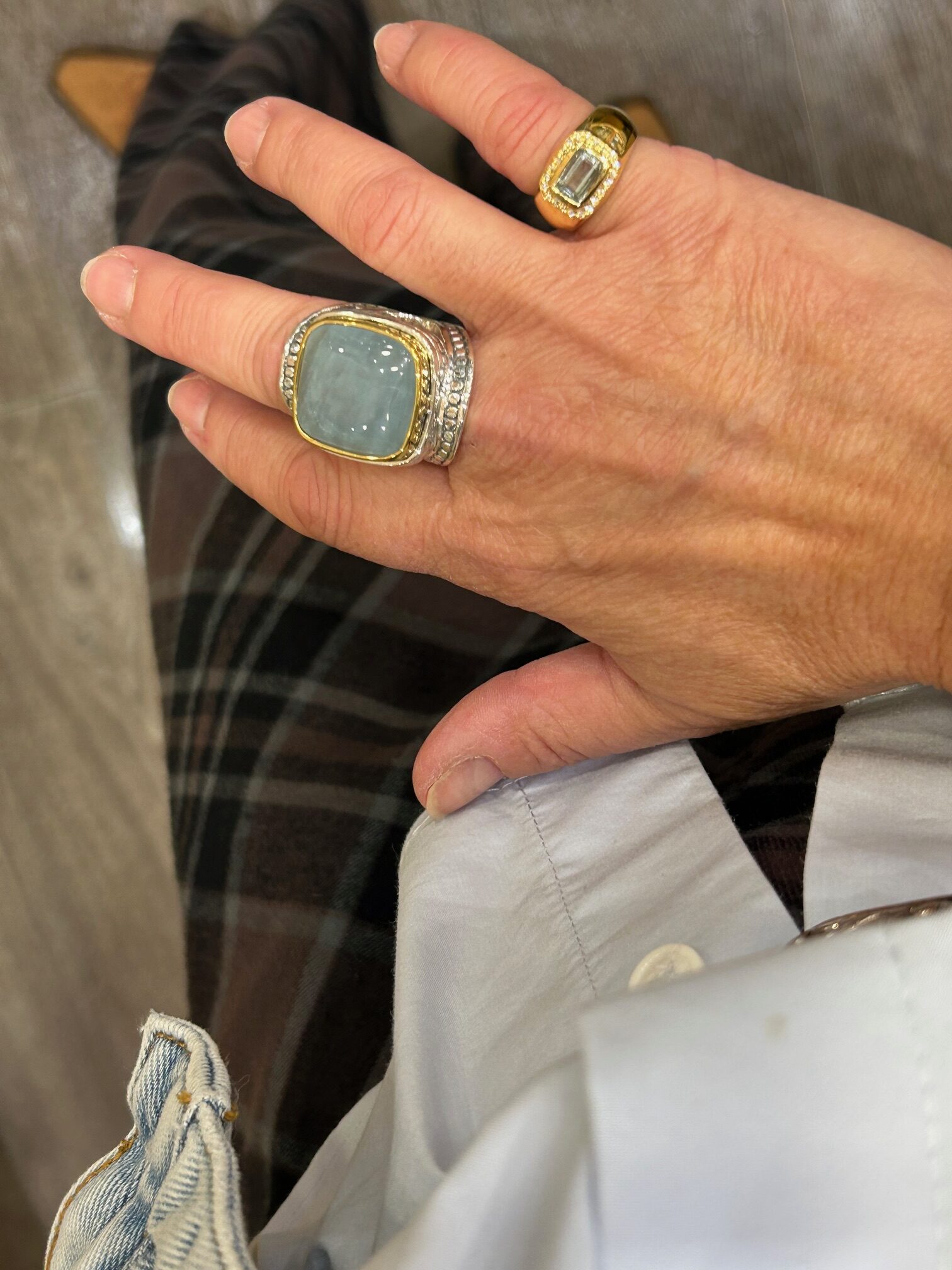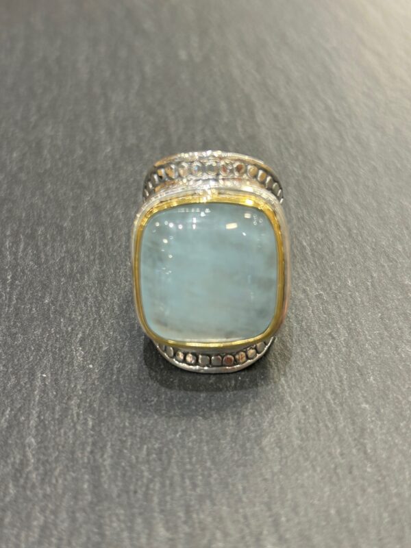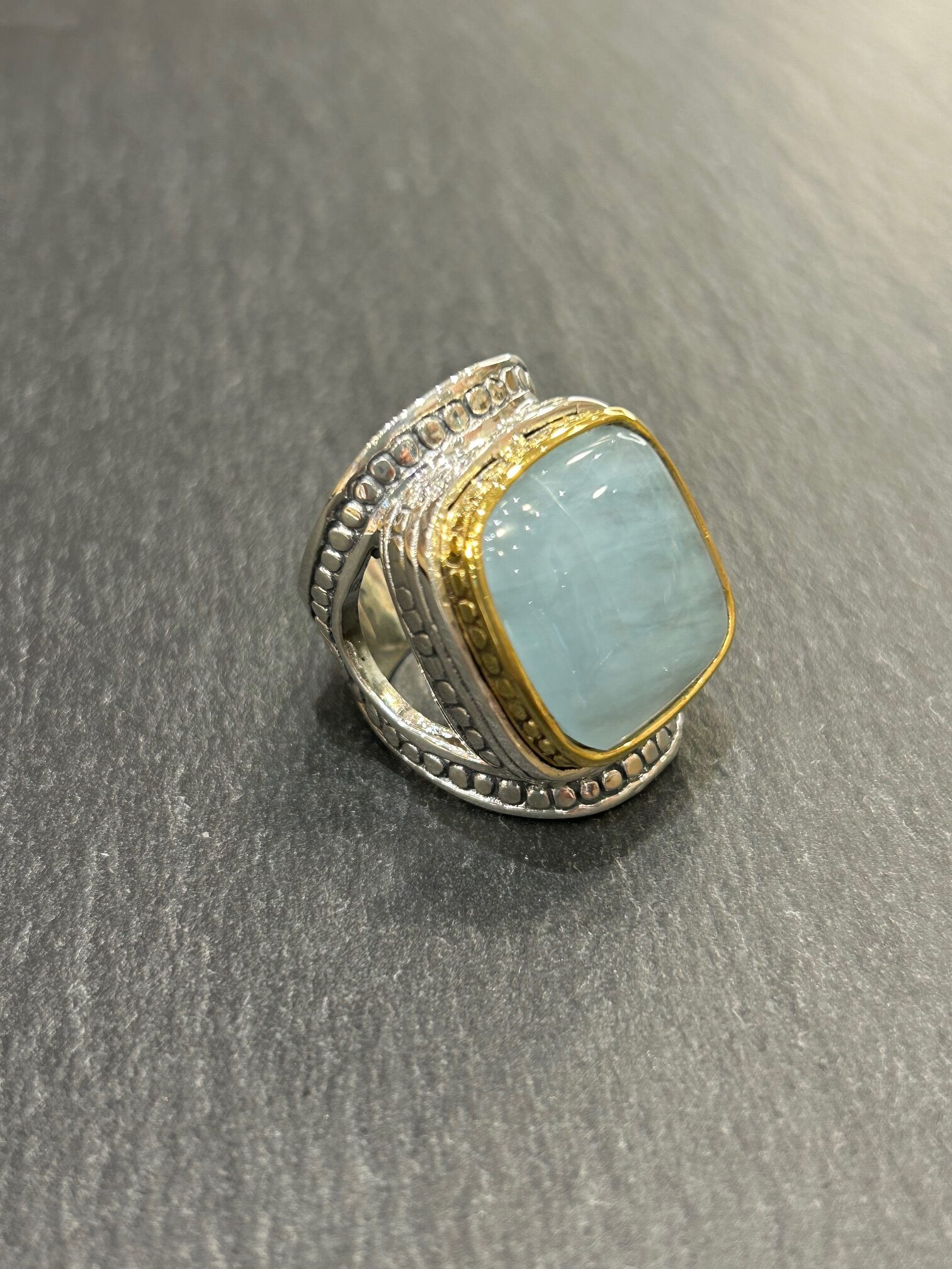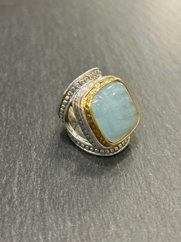 Confectionnée en argent 925, cette bague associe la noblesse du métal à la douceur d’une pierre aigue marine sertie de laiton. Ainsi, le contraste entre la brillance de l’argent et les reflets bleus de la pierre crée un jeu de lumière fascinant. Par ailleurs, sa pierre de 2 cm par 2 cm attire le regard sans excès, tout en sublimant la main avec délicatesse.