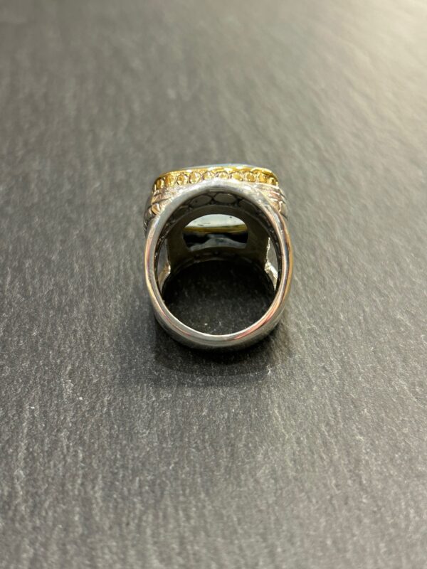 La monture, fine mais affirmée, épouse parfaitement le doigt. De plus, sa longueur de 3 cm sur la main offre une présence élégante et contemporaine. Cette bague se porte donc aussi bien au quotidien qu’avec une tenue habillée, apportant une touche de fraîcheur et de sophistication.