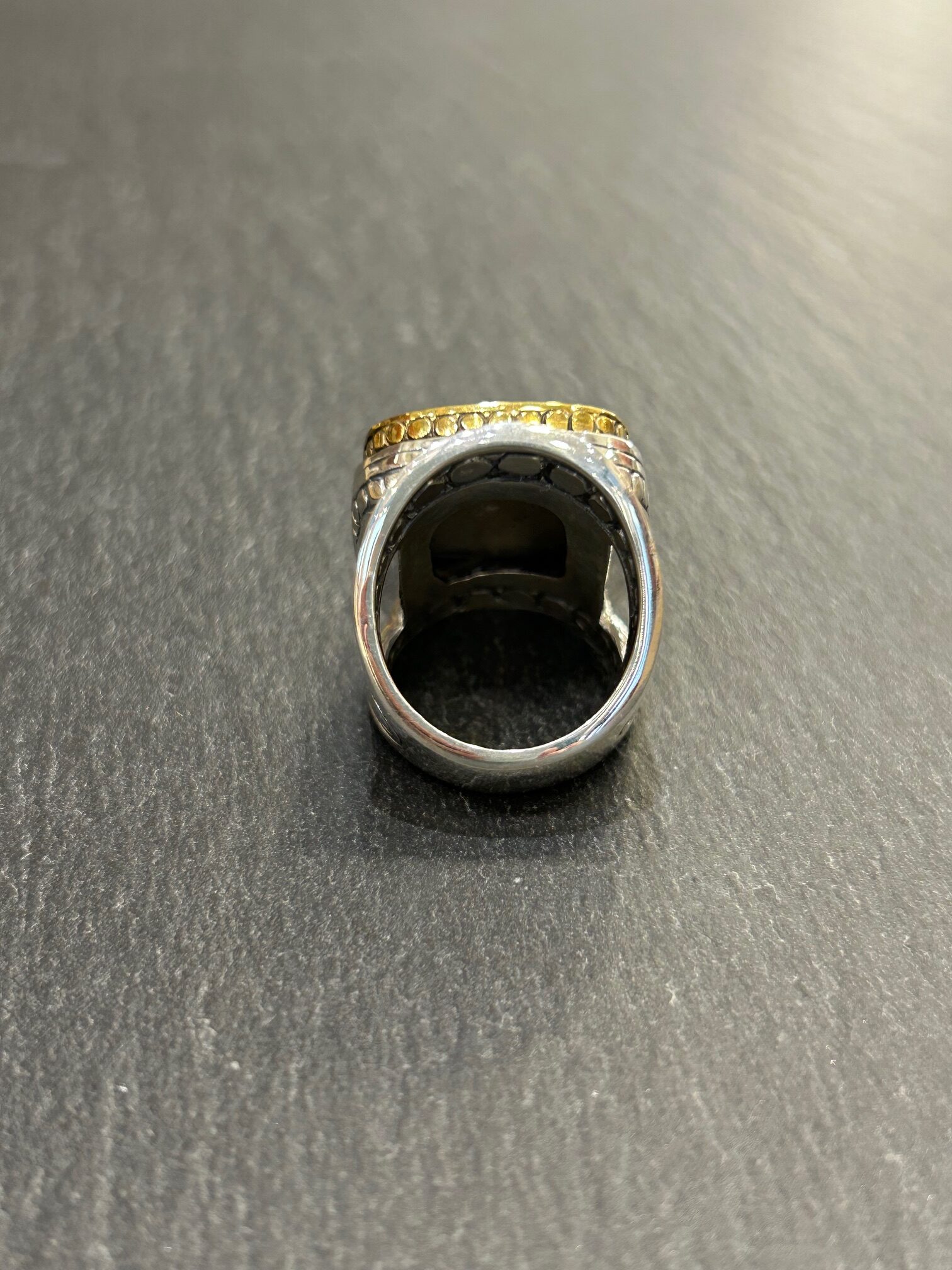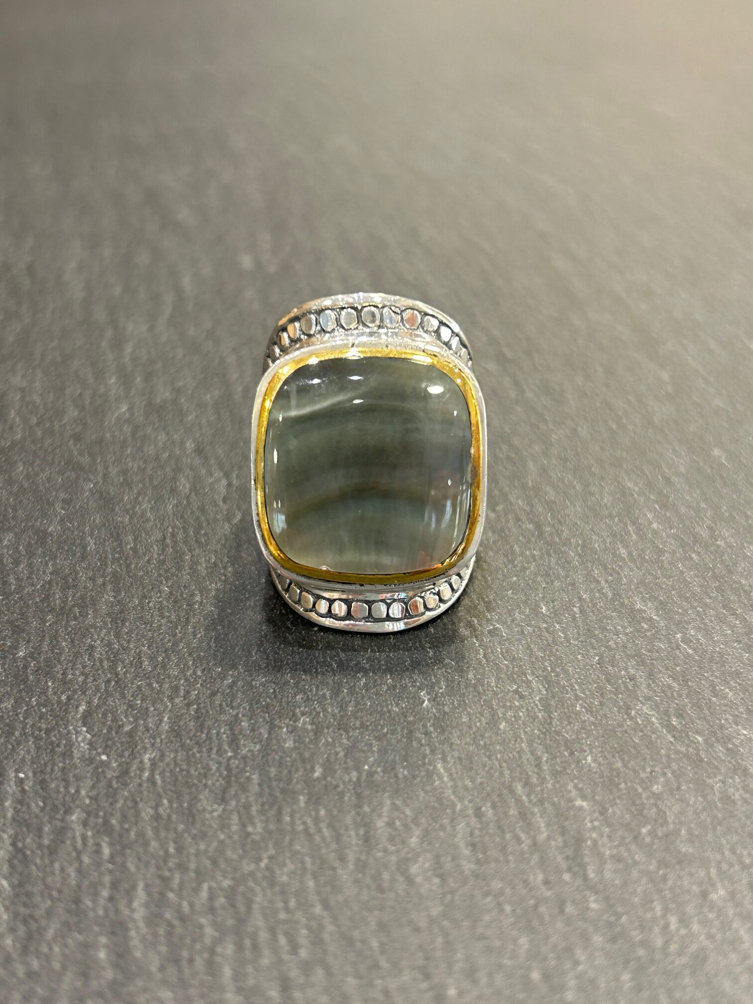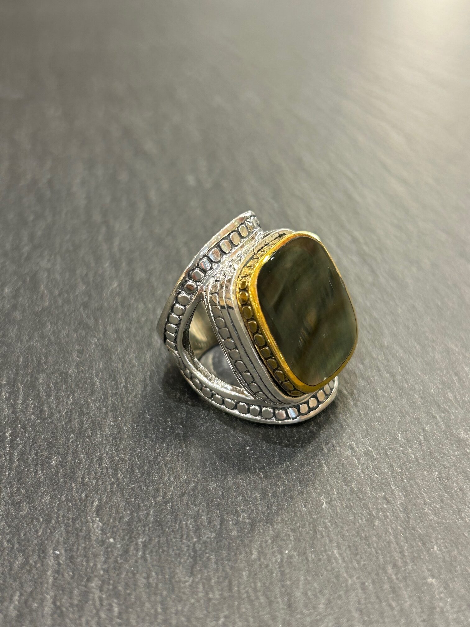 La pierre, d’une dimension de 2 cm sur 2 cm, dévoile un éclat subtil qui change au gré des reflets. Sertie dans un délicat cerclage de laiton doré, elle se distingue par un contraste harmonieux entre le gris profond de la nacre et la chaleur du métal. Ainsi, la bague offre un jeu de lumière captivant, à la fois discret et somptueux.