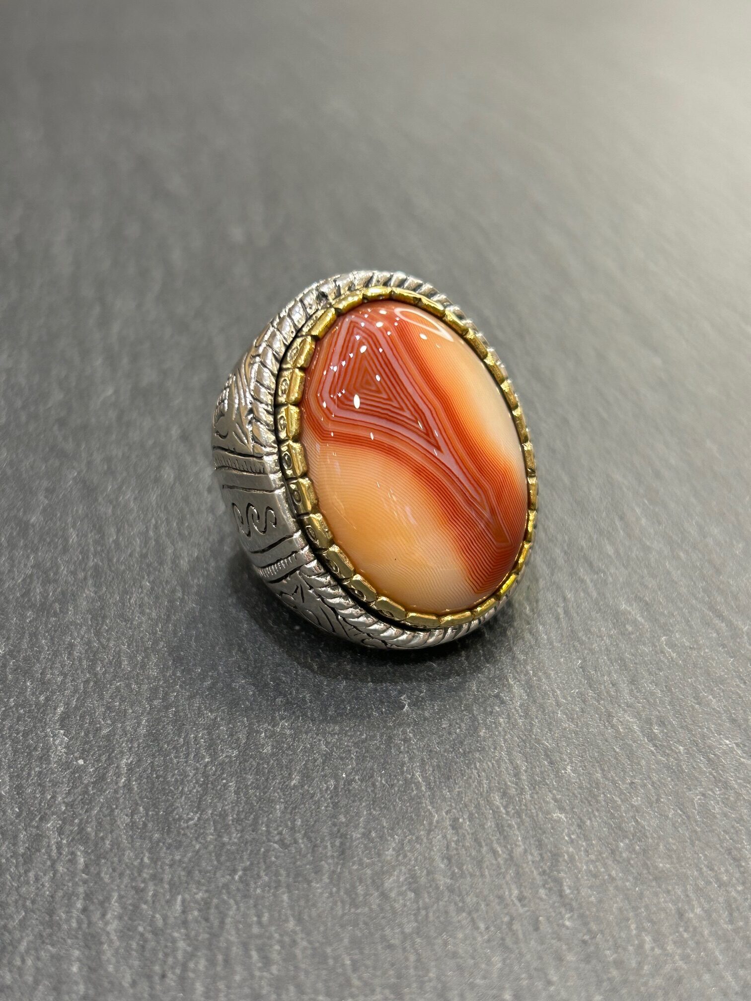 La pierre, mesurant 3 x 2,2 cm, capte la lumière avec intensité. Sa longueur de 3,5 cm sur le doigt assure une présence affirmée sans excès. Ainsi, elle s’impose comme un bijou d’expression, idéal pour les femmes qui aiment unir raffinement et singularité. De plus, le sertissage en laiton apporte une note dorée subtile, qui réchauffe l’argent et exalte la couleur ardente de la pierre.