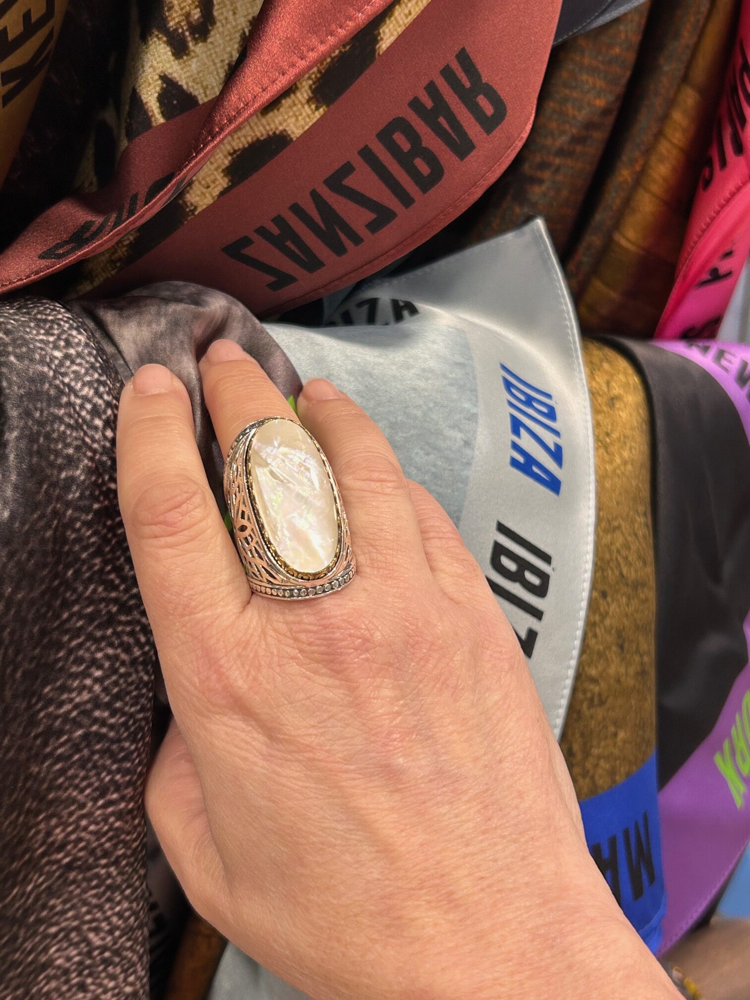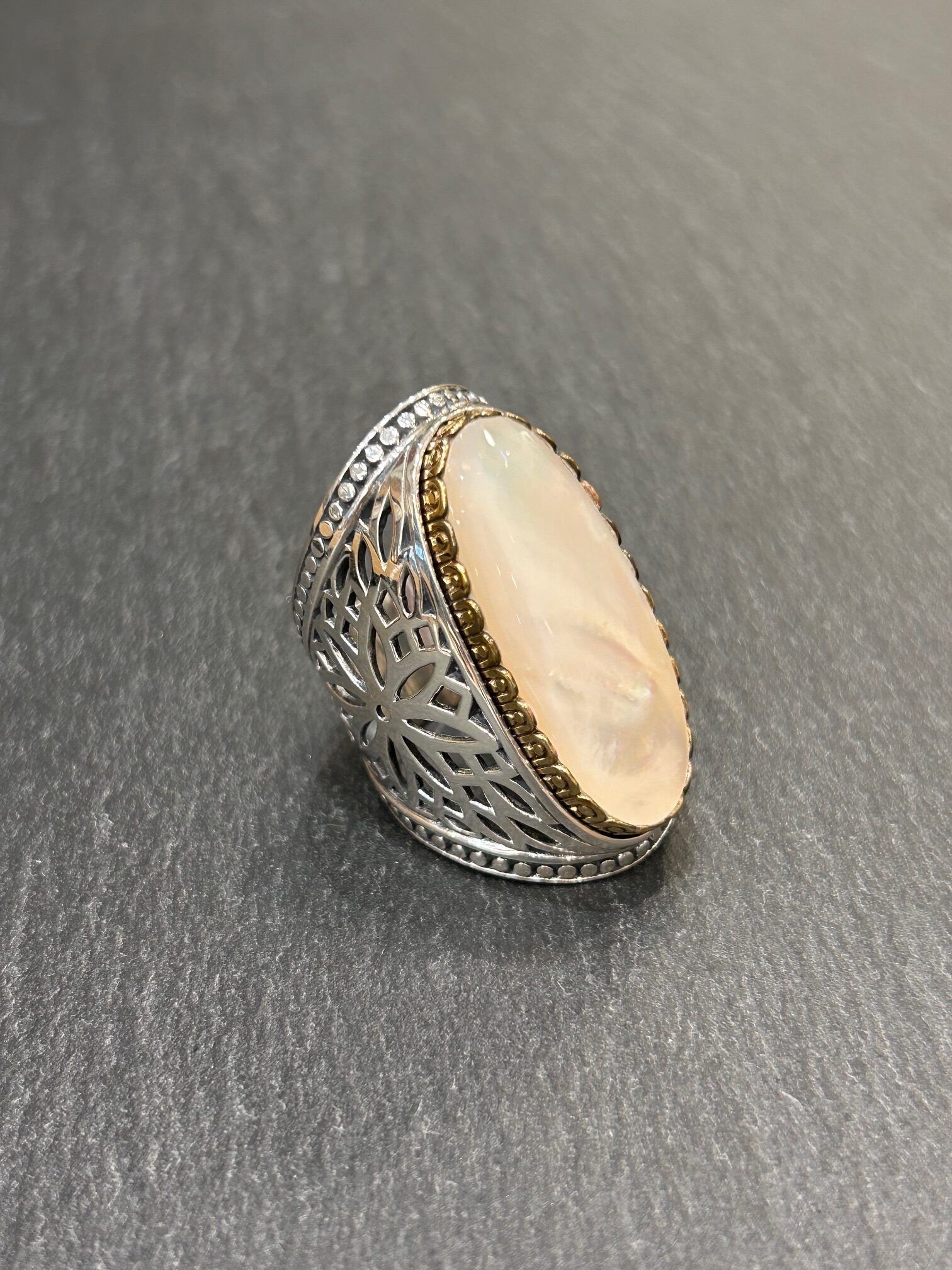 L’artisan travaille l’argent 925 avec précision afin de créer un motif finement dentelé. De plus, ce décor ajouré apporte légèreté et sophistication à l’ensemble. La nacre, sertie en laiton, contraste harmonieusement avec la monture argentée. Par ailleurs, ses dimensions généreuses habillent parfaitement le doigt tout en restant confortables au quotidien.