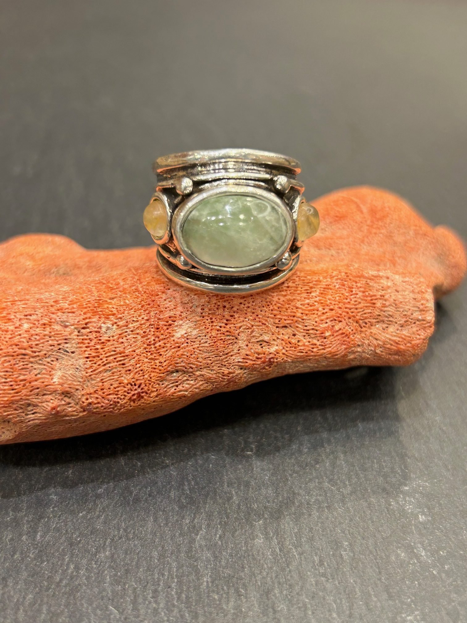 Bague en métal argenté ornée d’ un cabochon en prehnite avec sur le coté deux petits cabochons en hématoide jaune.