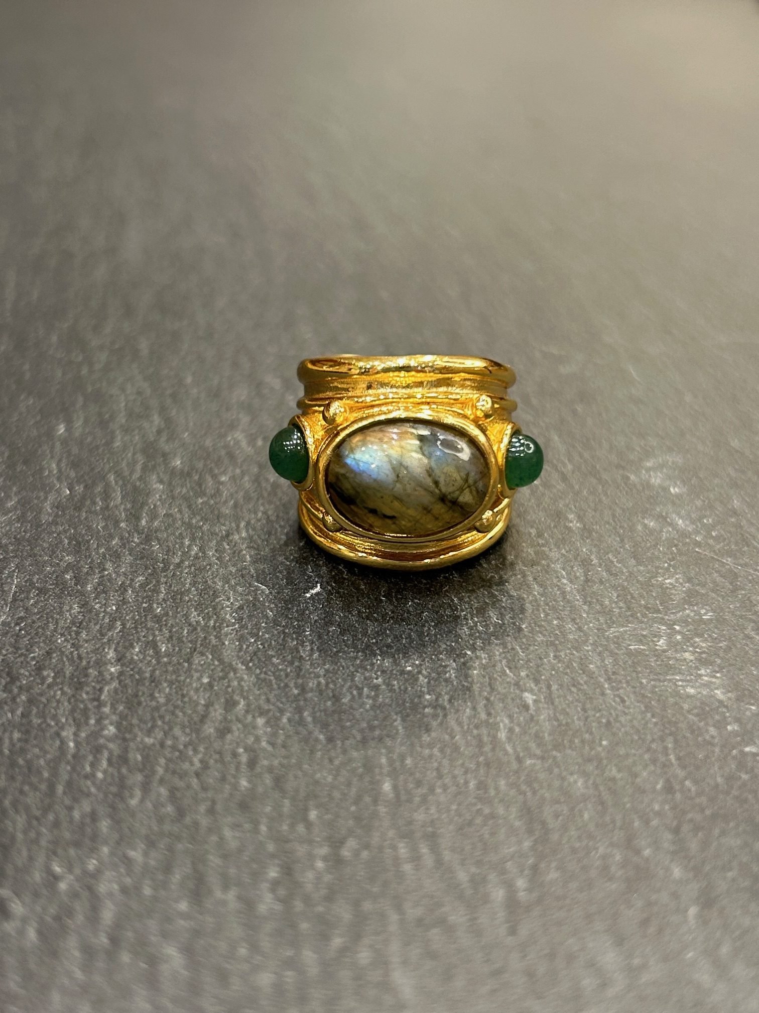 Bague en métal doré à l’or fin ornée d’ un cabochon en labradorite avec sur le coté deux petits cabochons en quartz vert.