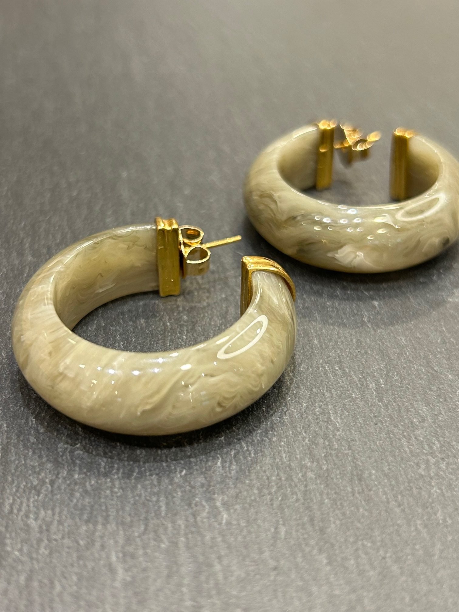 Boucles d’oreilles créoles en acétate kaki, extrémités dorées à l or 24 carats