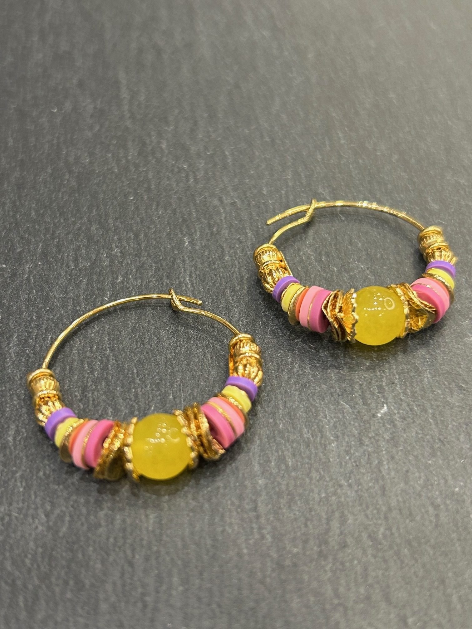 Boucles d’oreilles créoles dorées à l or 24 carats, ornées de pampilles dorées et de perles dans les tons de mauve jaune et rose.