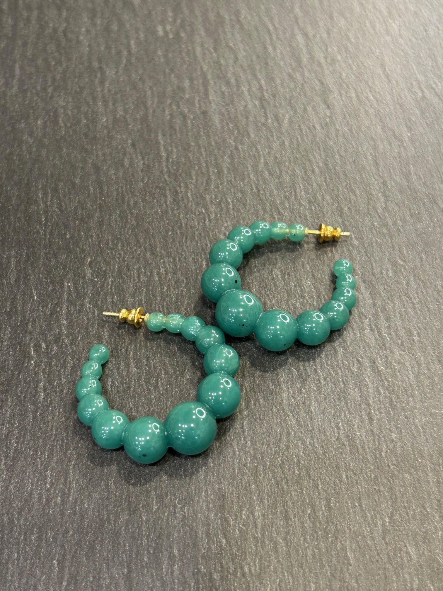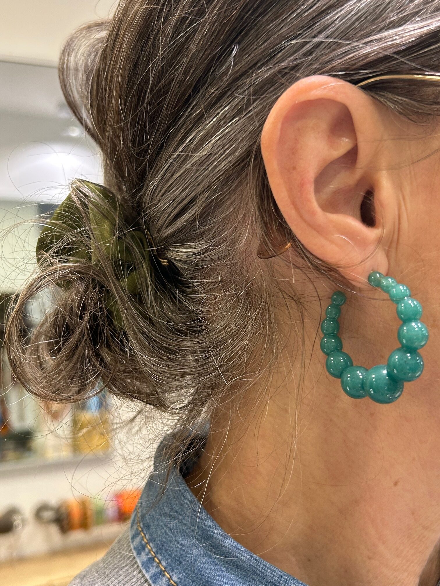 Les boucles d’oreilles Andy séduisent par leur allure moderne et lumineuse. Leur forme créole, d’un diamètre de 3,8 cm, crée une ligne douce et harmonieuse. Ainsi, ces boucles apportent immédiatement une note contemporaine à chaque silhouette. L’acétate vert, travaillé en boules de différents diamètres, donne un rythme élégant au bijou.